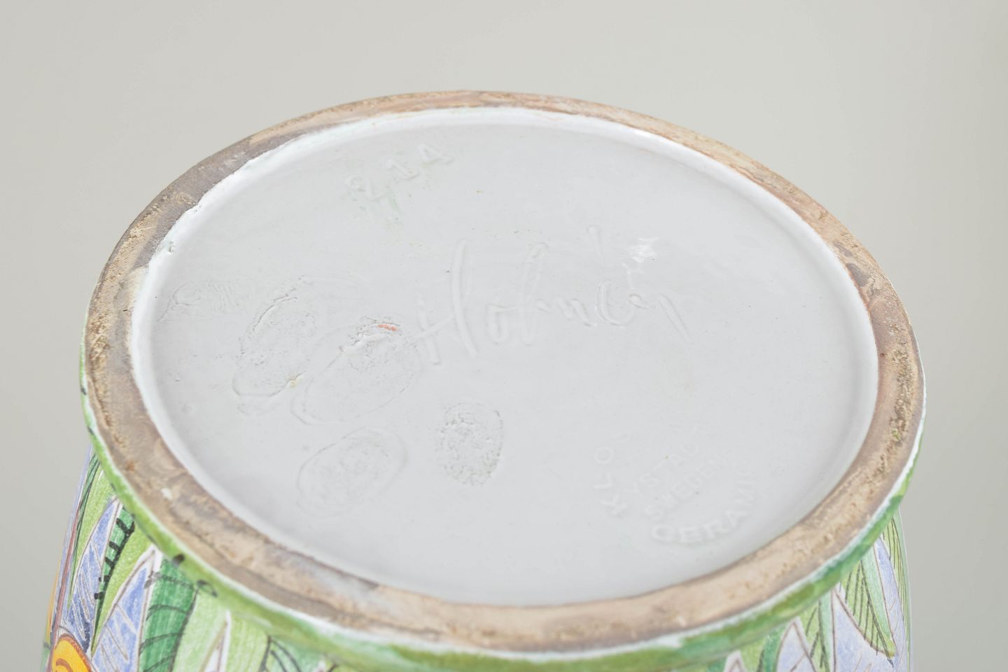 Per-Olof Holmén (b. 1940) was a Swedish ceramic artist and painter, known for his vivid depictions of animals and nature. At Kloster Keramik, he developed a distinctive style combining colourful hand-painted decoration with classic vase forms. His works are today sought after among collectors of Swedish studio ceramics.