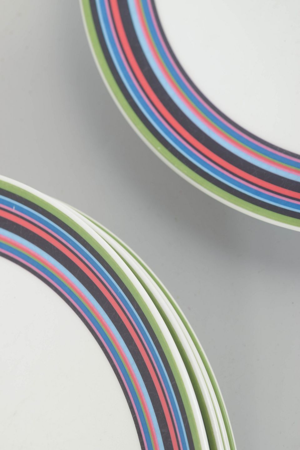 Set of five large porcelain plates featuring the distinctive multicoloured striped pattern designed by Alfredo Häberli for Iittala. The series combines functionality with playful colours and a timeless form, making it a modern classic in Nordic design.