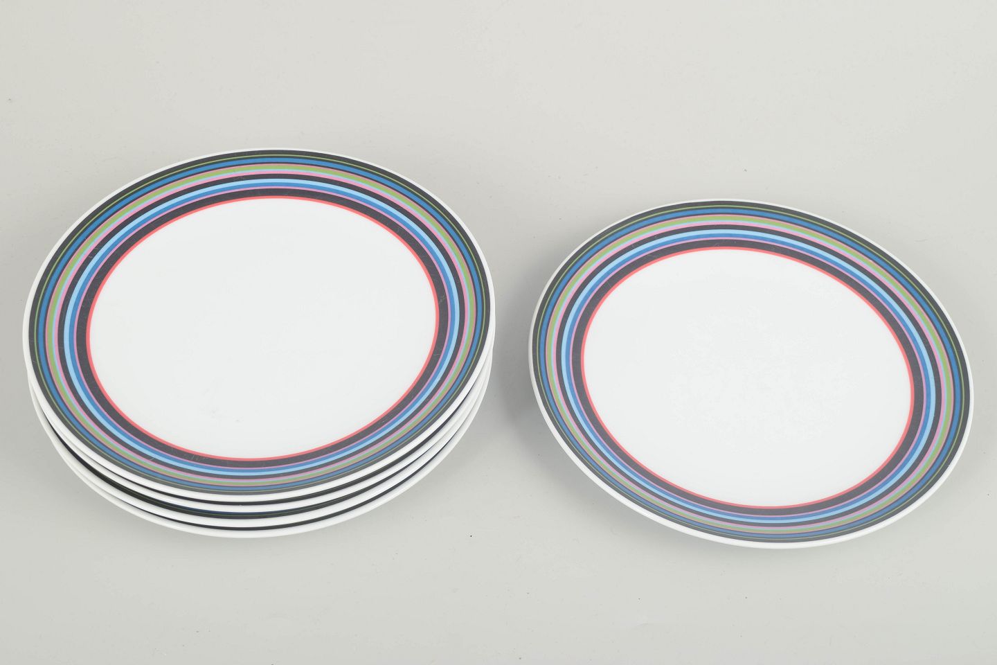 Set of five porcelain plates featuring the distinctive multicoloured striped pattern designed by Alfredo Häberli for Iittala. The series combines functionality with playful colours and timeless form, making it a modern classic in Nordic design.