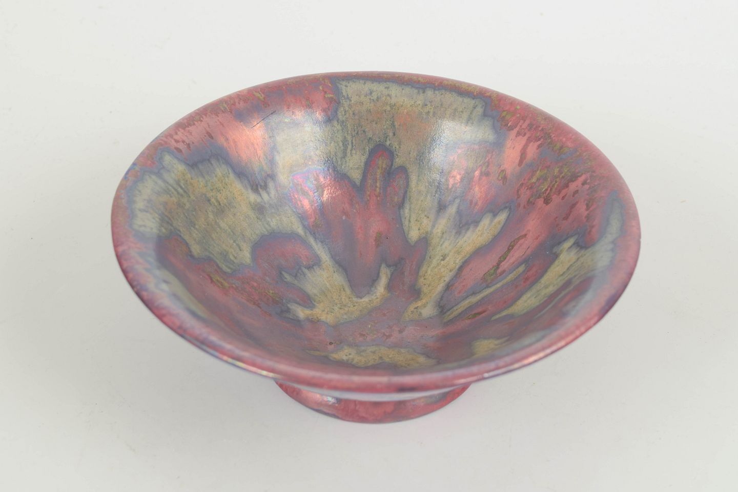 Hand-thrown stoneware bowl on a small foot with flared rim and an experimental multicoloured glaze in shades of pink, blue, lilac and green. A characteristic example of Andersson’s work for Höganäs during the 1970s, combining traditional forms with artistic glaze effects.