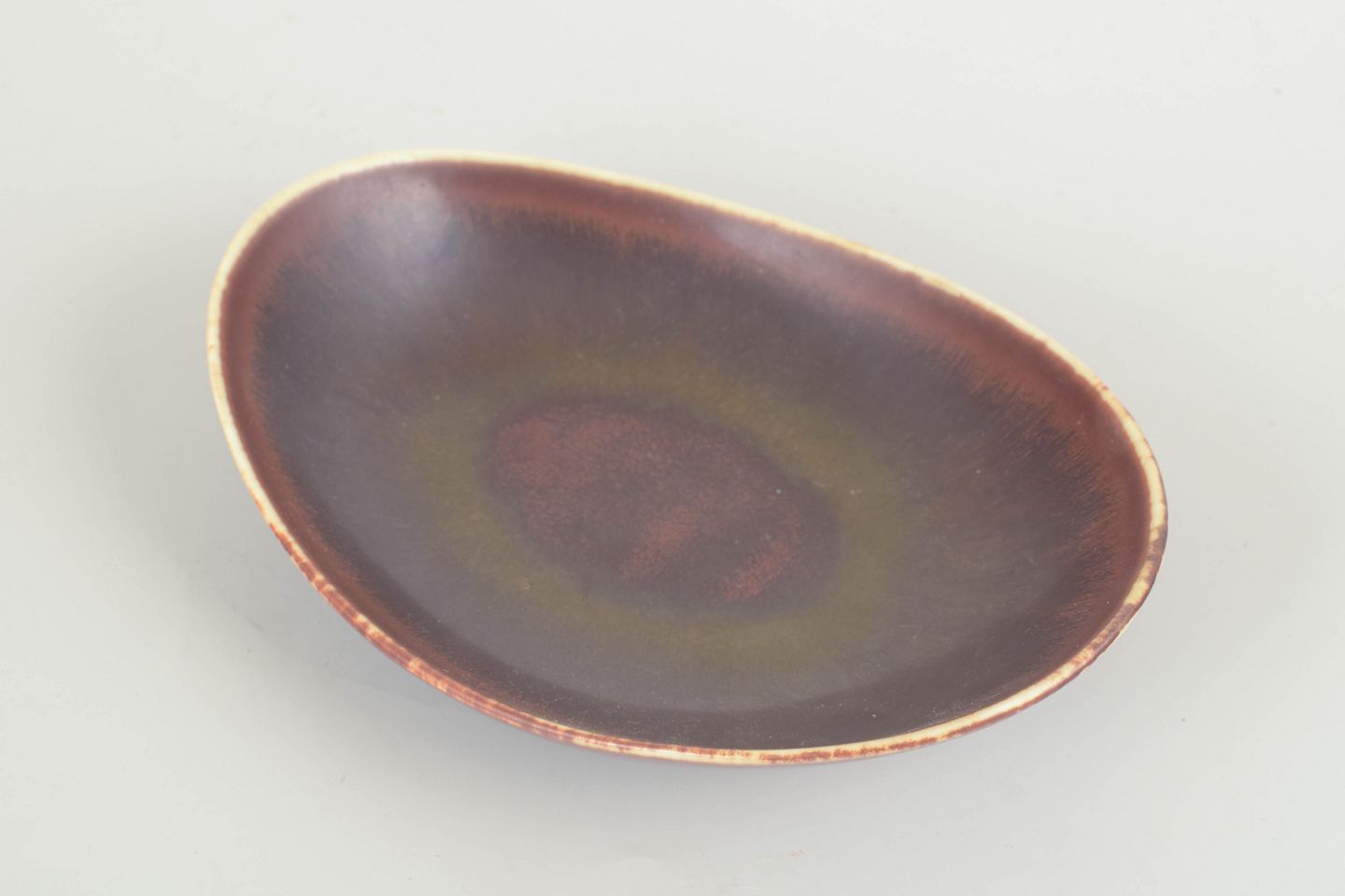 Asymmetrical stoneware bowl with a matte reddish-brown glaze showing olive tones toward the centre and a light rim. A fine example of Stålhane’s sculptural sense of form and subtle glaze variation.
