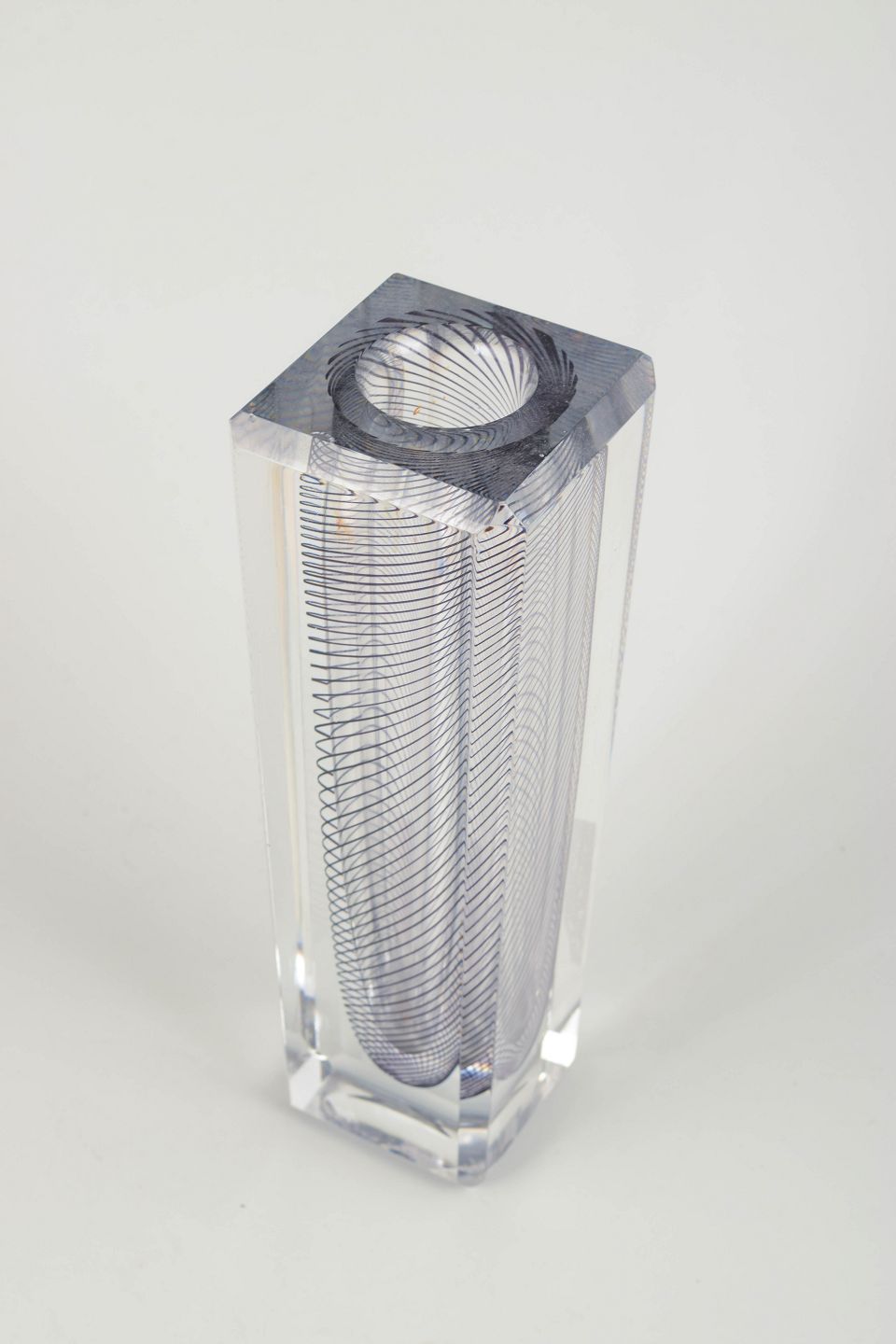 Optical vase in solid clear glass with embedded spiral black pattern, cut and polished on all sides. A refined example of Lindstrand’s late work for Kosta Boda, uniting technical precision and visual motion in a sculptural expression.