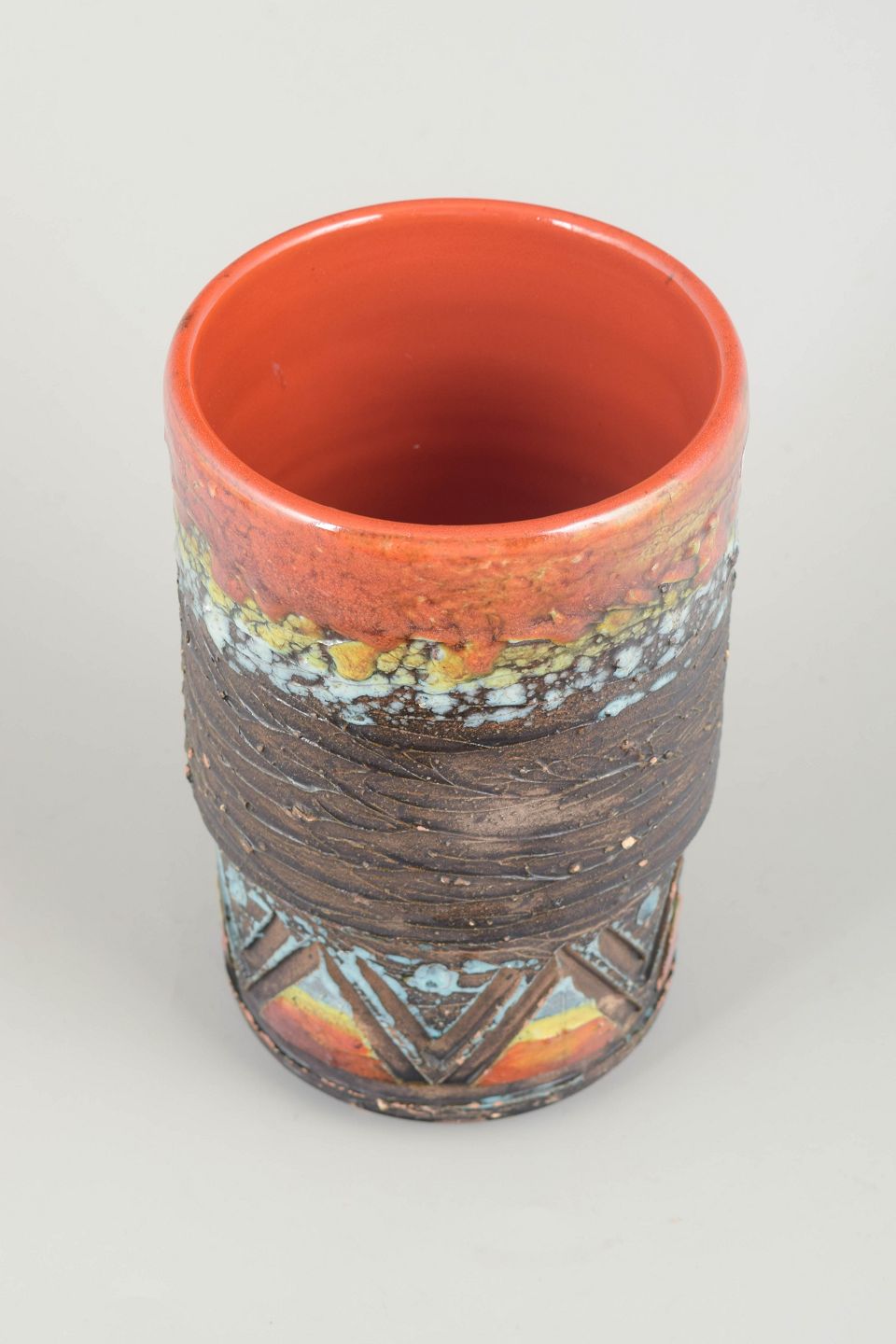 Cylindrical handmade vase in chamotte clay with rustic texture and geometric relief decoration. The surface features multicoloured lava-effect glazes in tones of red, orange, blue and brown, with a smooth glossy interior in coral red. A characteristic example of Tilgmans’ combination of raw materiality and expressive glaze work.