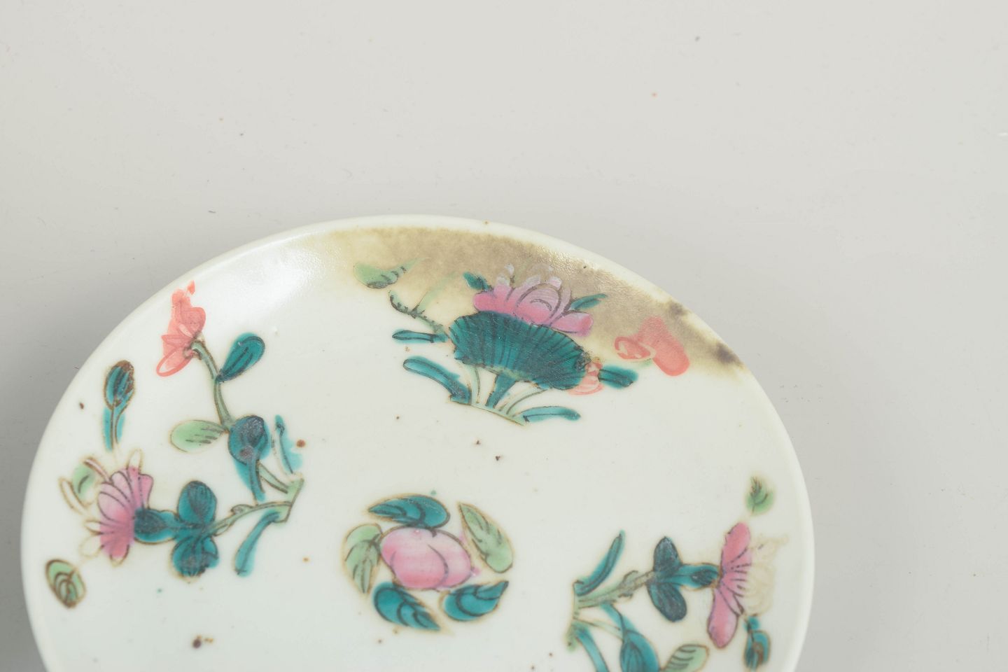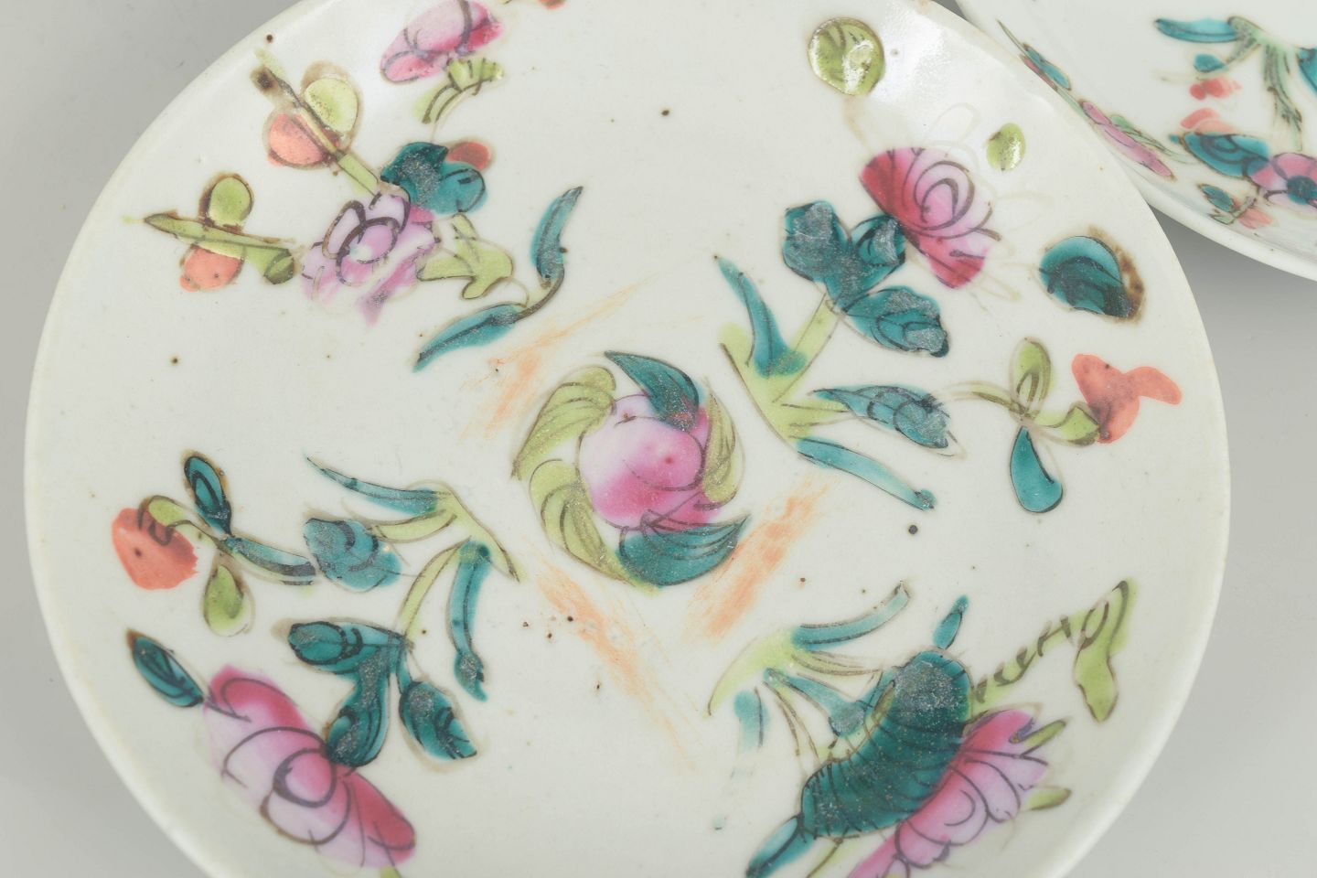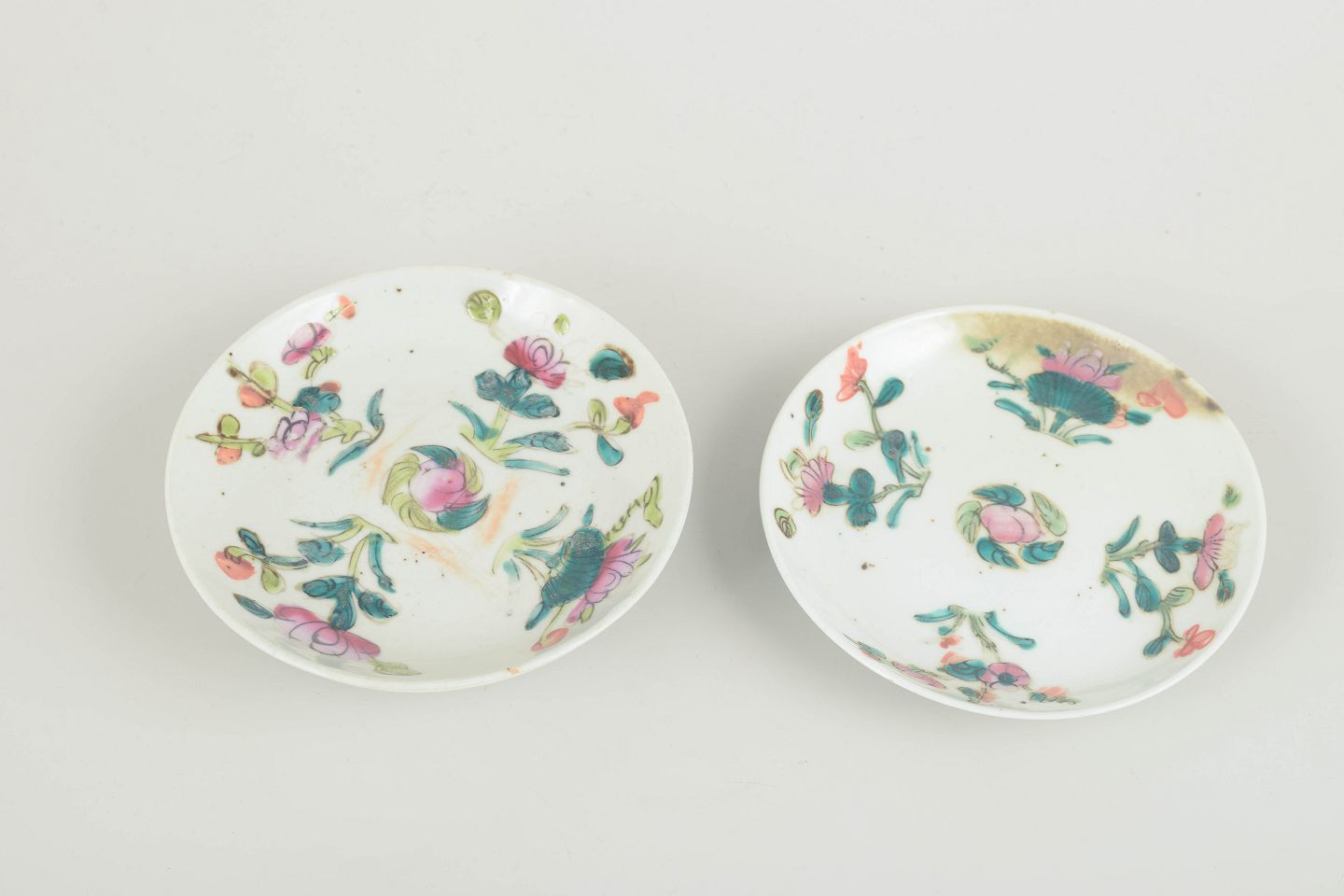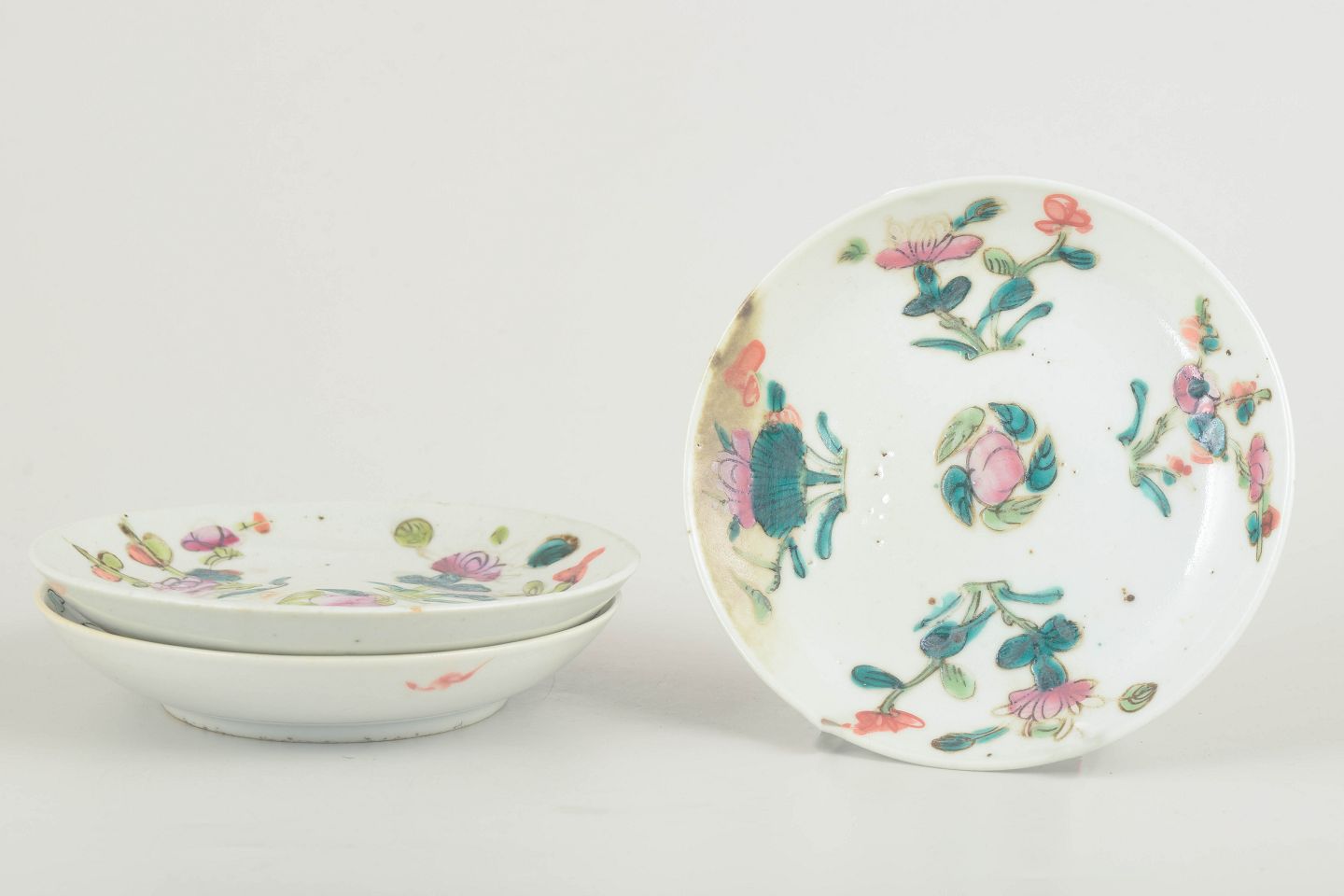 Set of three small white porcelain plates decorated in the famille rose palette with hand-painted floral and leaf motifs in shades of pink, green, and turquoise. Typical of the Qing dynasty decorative style, with vivid colours and delicate brushwork.