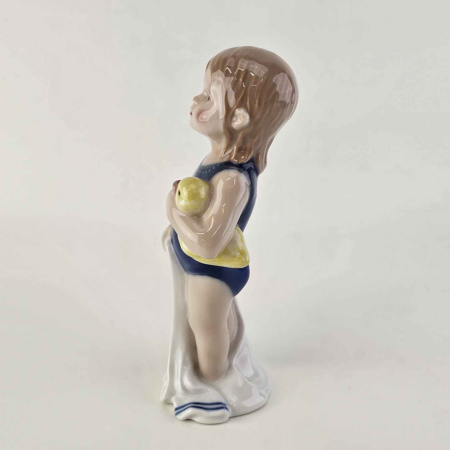 Figur i kongeligt porcelæn med form af en lille pige i en blå badedragt med et håndklæde og en badeand
