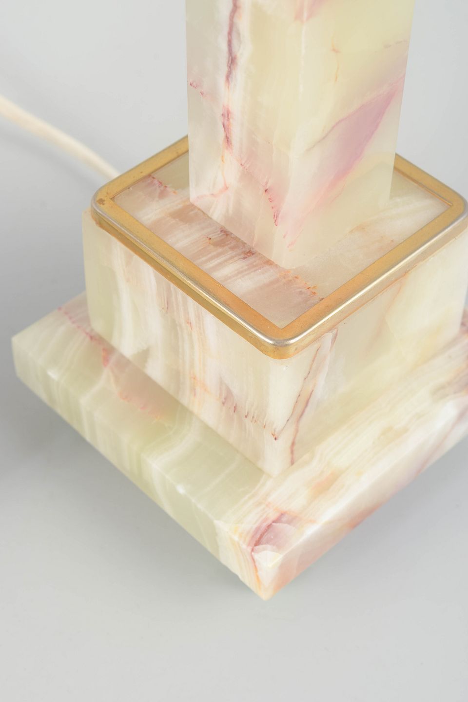 Elegant pair of polished onyx table lamps with natural veining in soft green, pink, and cream tones. Brass detailing at base and top, mounted on small glass ball feet. A fine example of Italian craftsmanship rooted in Volterra’s stone-carving tradition.
