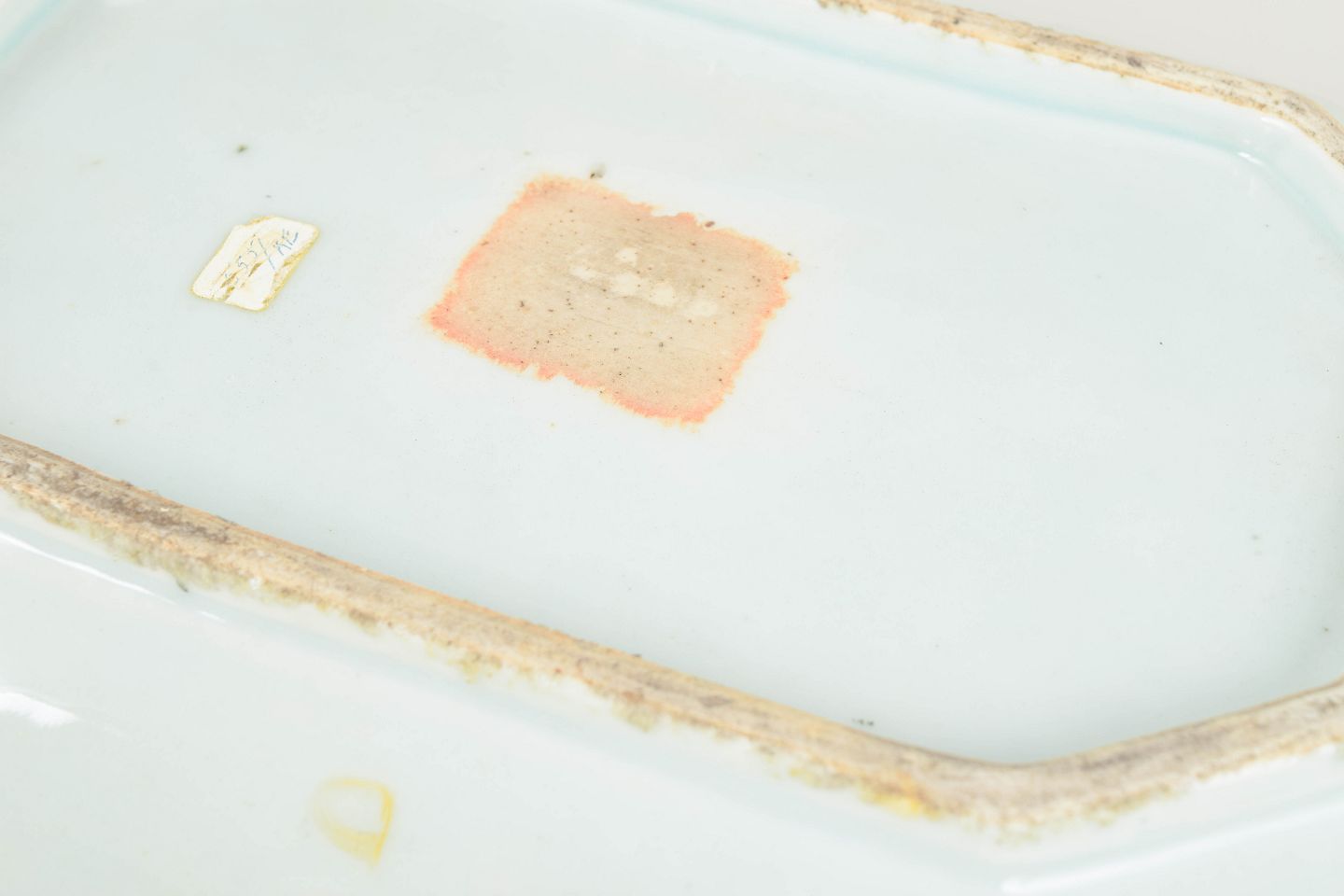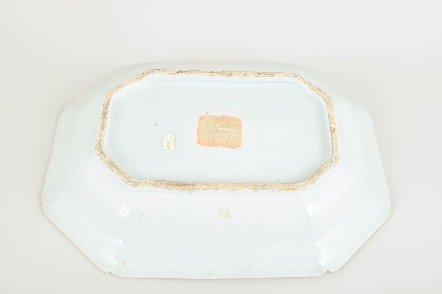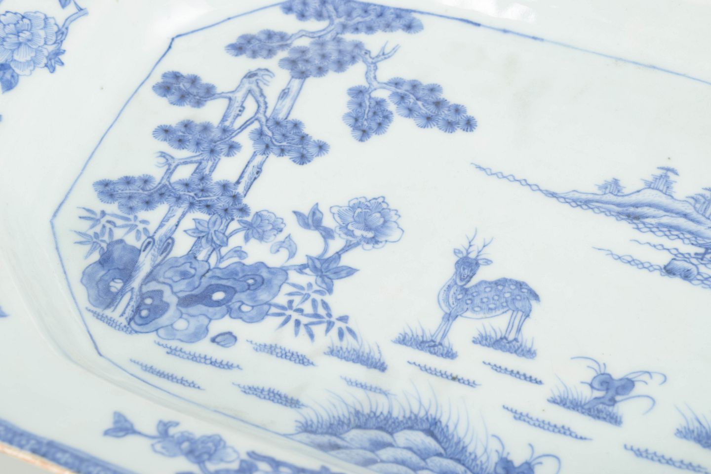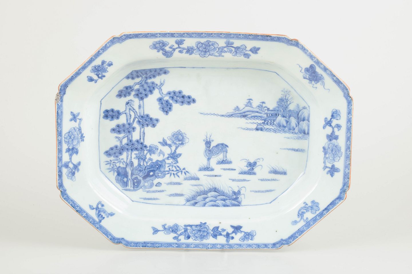 Hand-painted octagonal porcelain dish with classic blue and white decoration. The scene depicts a landscape with deer, trees, and pavilion, framed by a floral border around the rim.