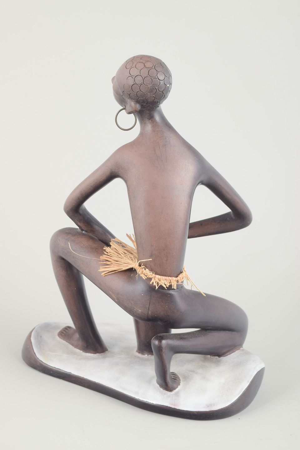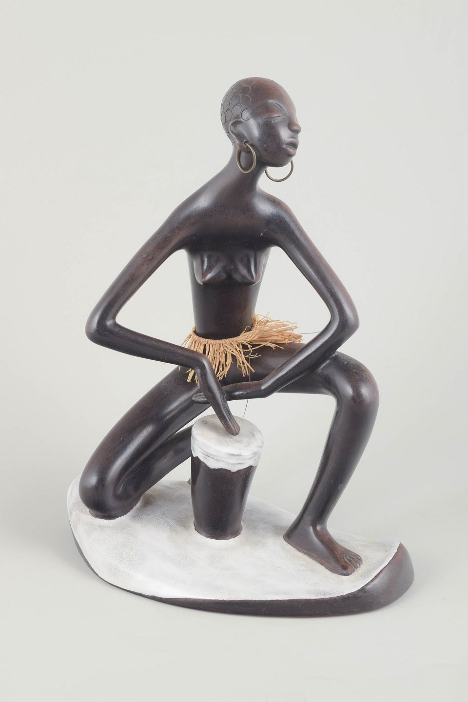 Large ceramic figure of a kneeling woman with drum, in dark brown glaze with white base and straw skirt. Typical of Anzengruber’s exoticized figurative style of the period.