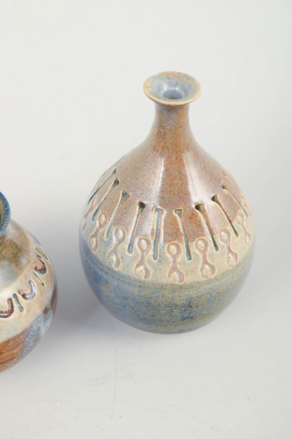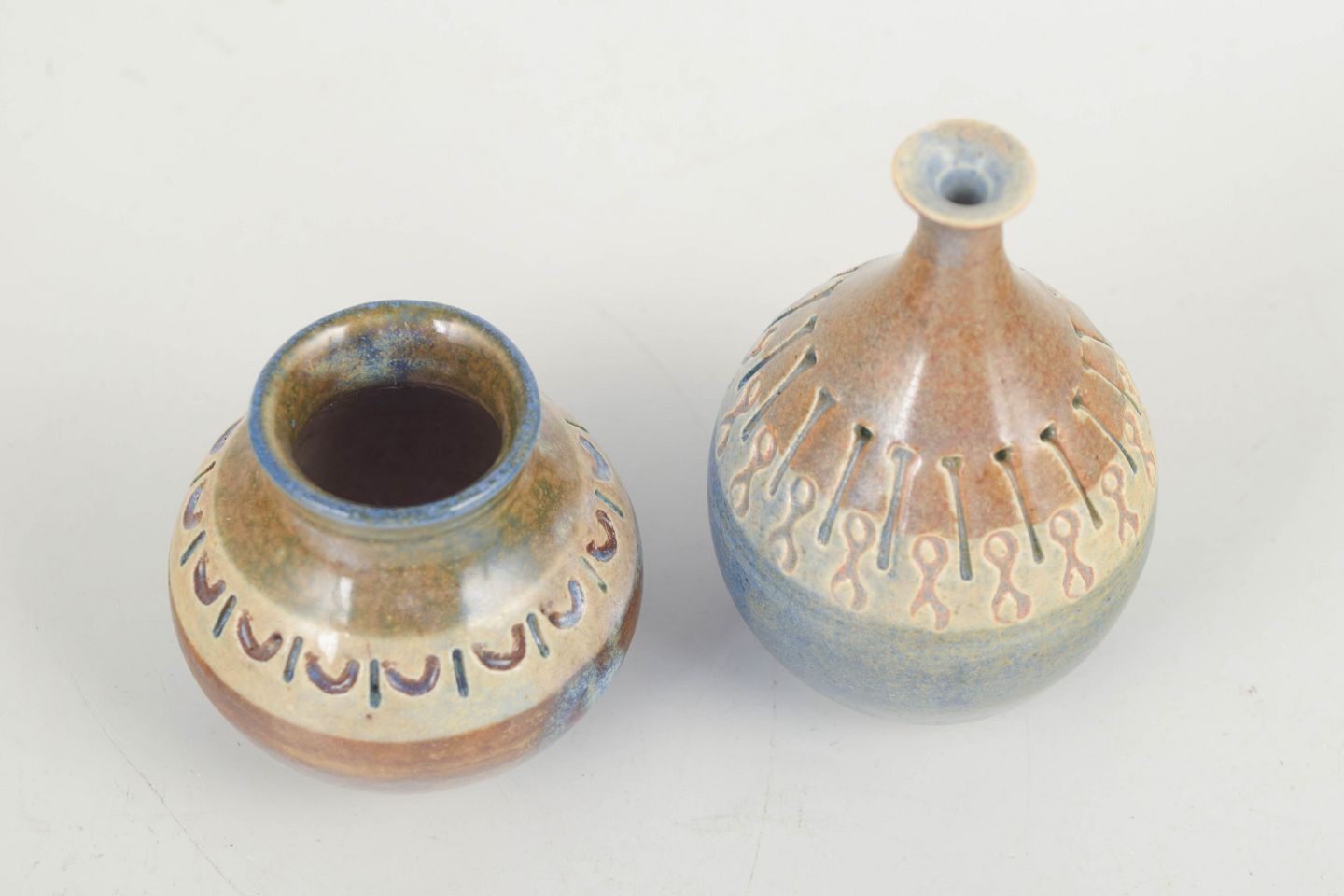 Two stoneware miniature vases with blue, green and brown glaze and incised decorative band around the shoulder. Fine examples of 1970s Swedish studio pottery with natural tones and handcrafted character.