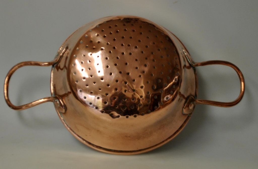 Copper colander, 19th century. Denmark. Unstamped. L: 35 cm. H.: 9 cm. Dia.: 21 cm.