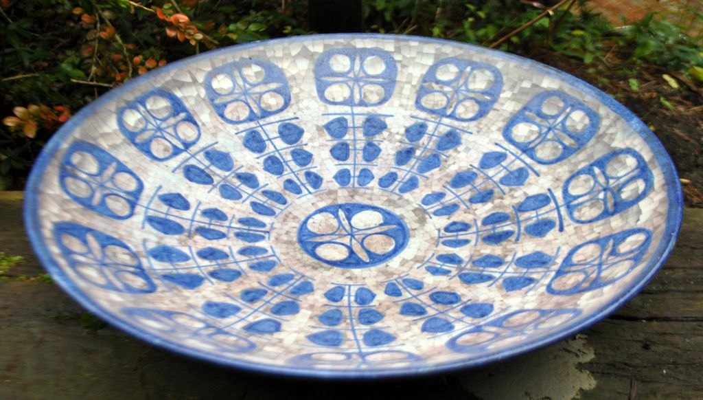Michael Andersen & Søn ceramic dish no. 4106-3, Bornholm, Denmark, after 1930. Decorated in blue/grey shades on a mosaic base. Signed MS and stamped with three fish. Dia: 40 cm.