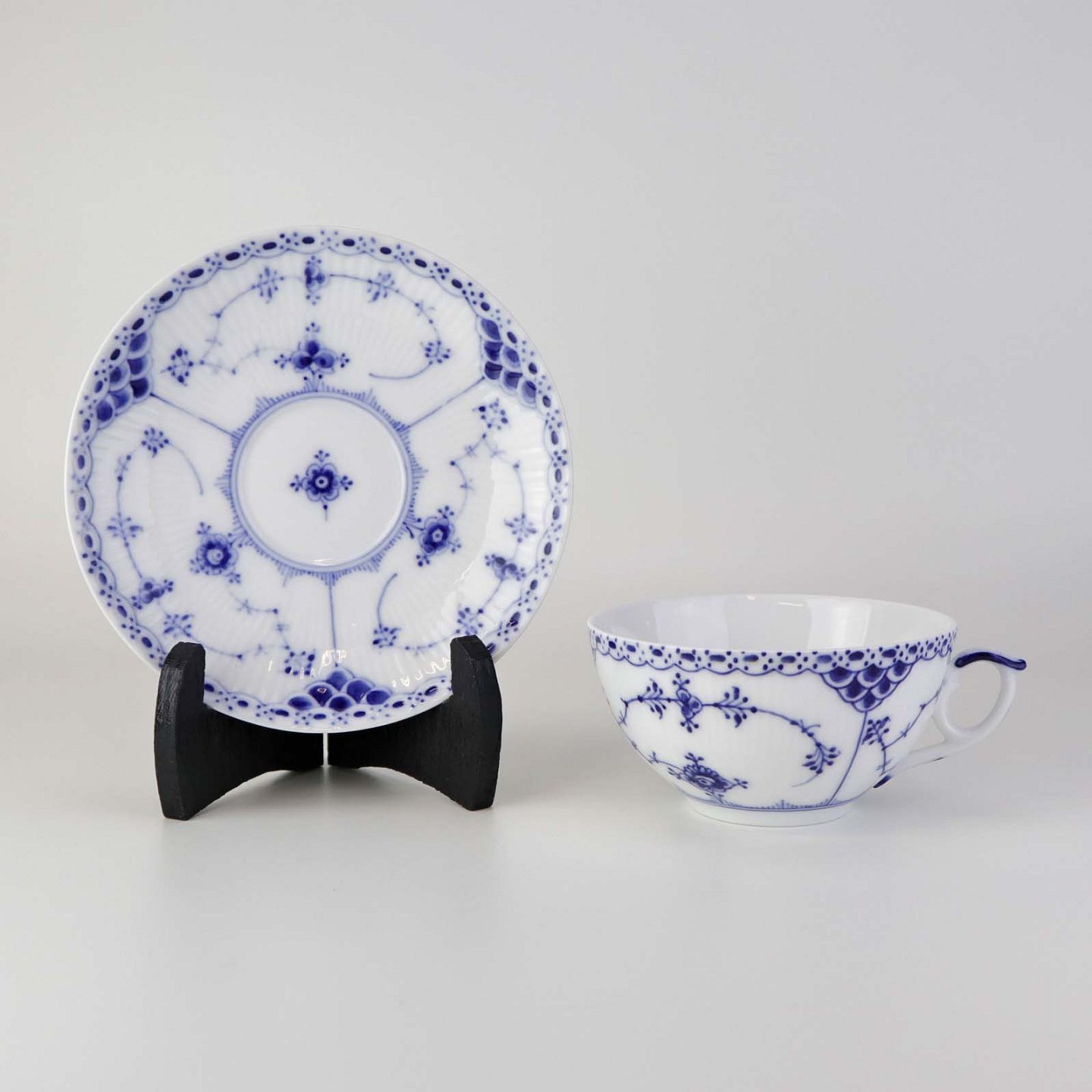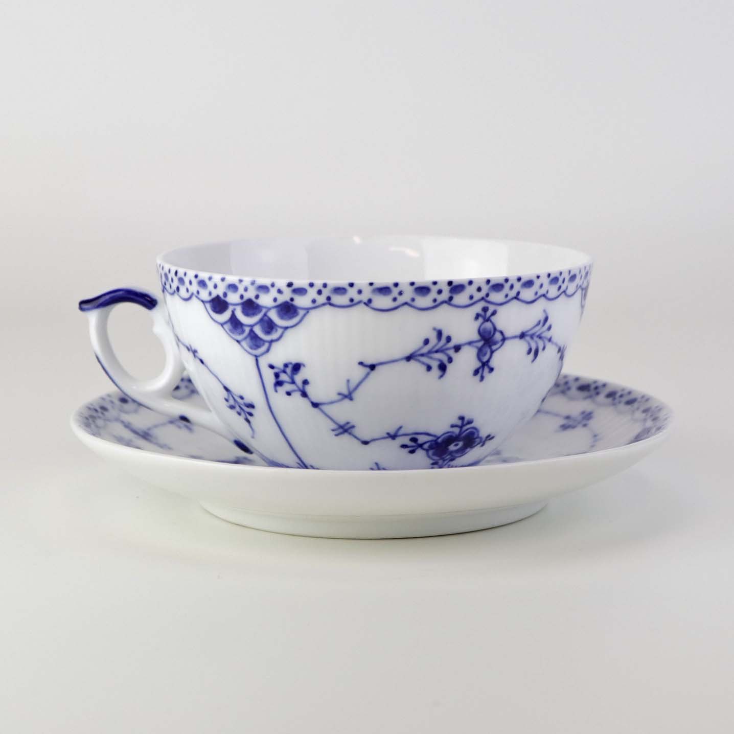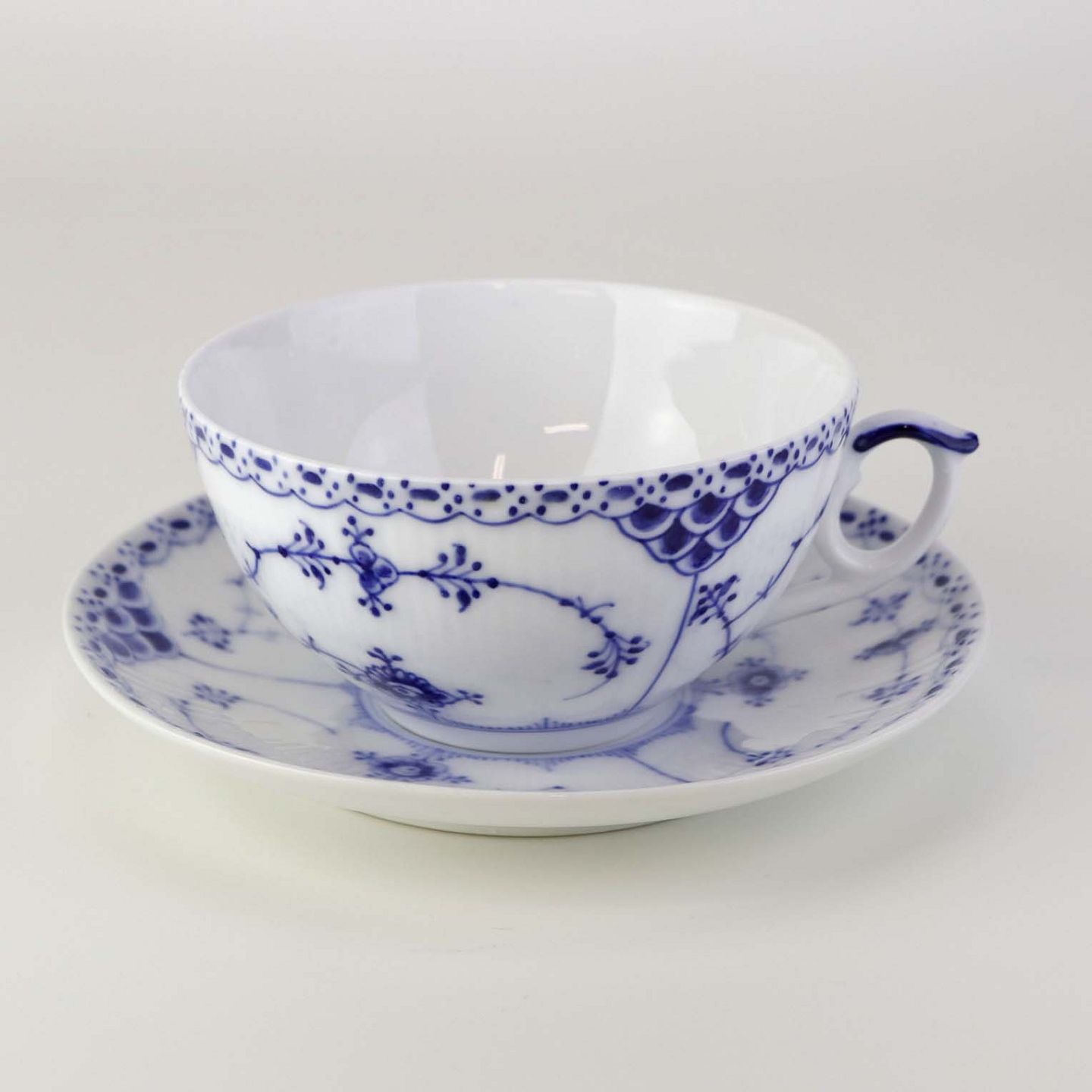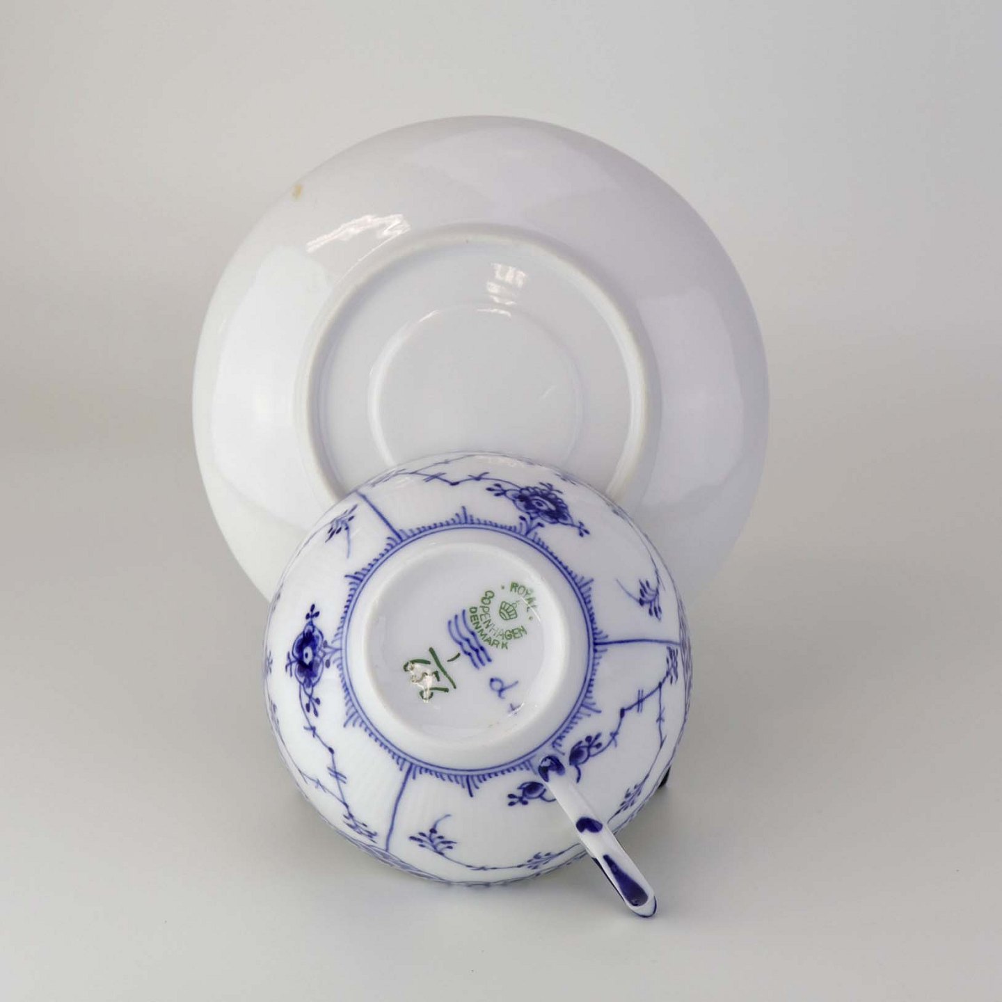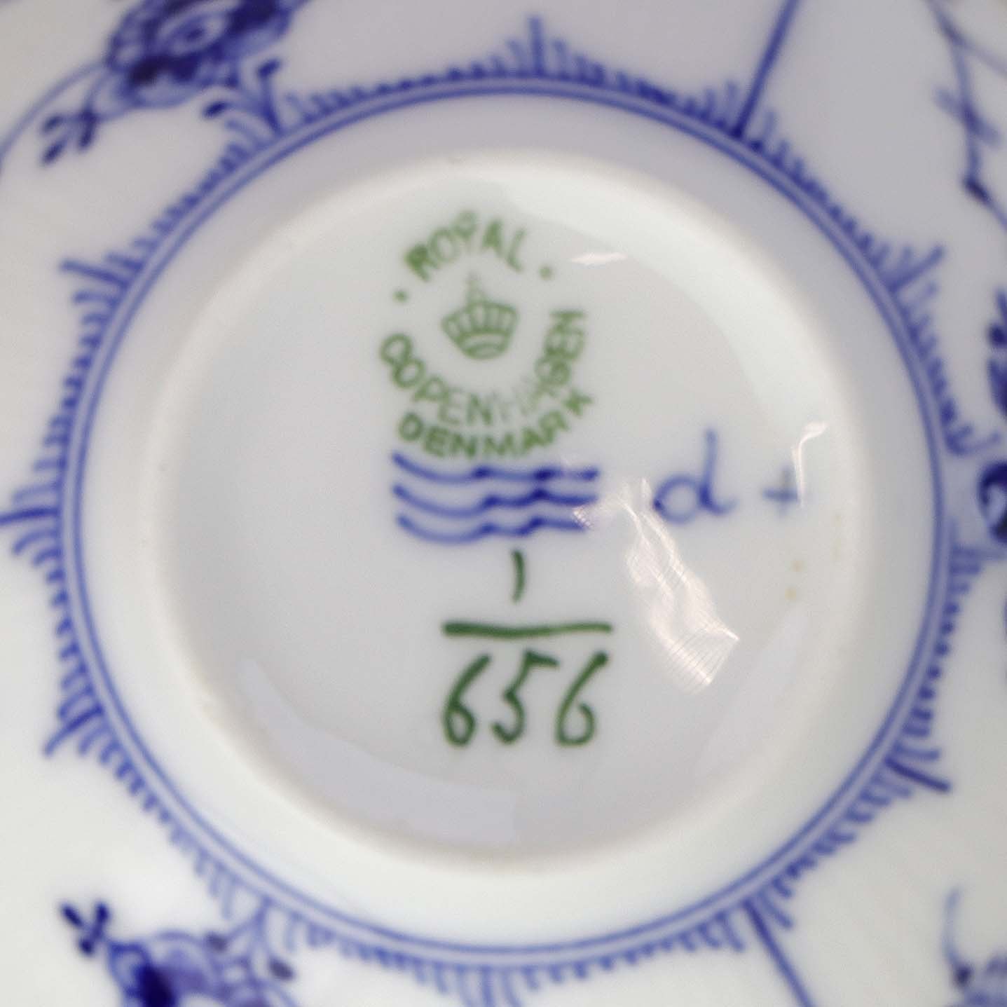 Stor tekop med underkop i kongeligt porcelæn fra stellet Musselmalet Halvblonde. Nr. 1/656 og 1/626