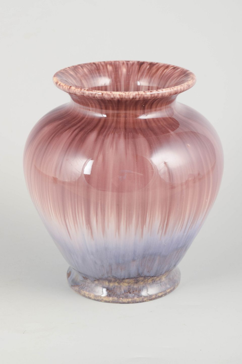Classic stoneware vase with a wide, flared rim and a beautiful vertical-running glaze in soft pink tones fading into blue hues toward the base. A decorative and characteristic glazing style of mid-century studio pottery.