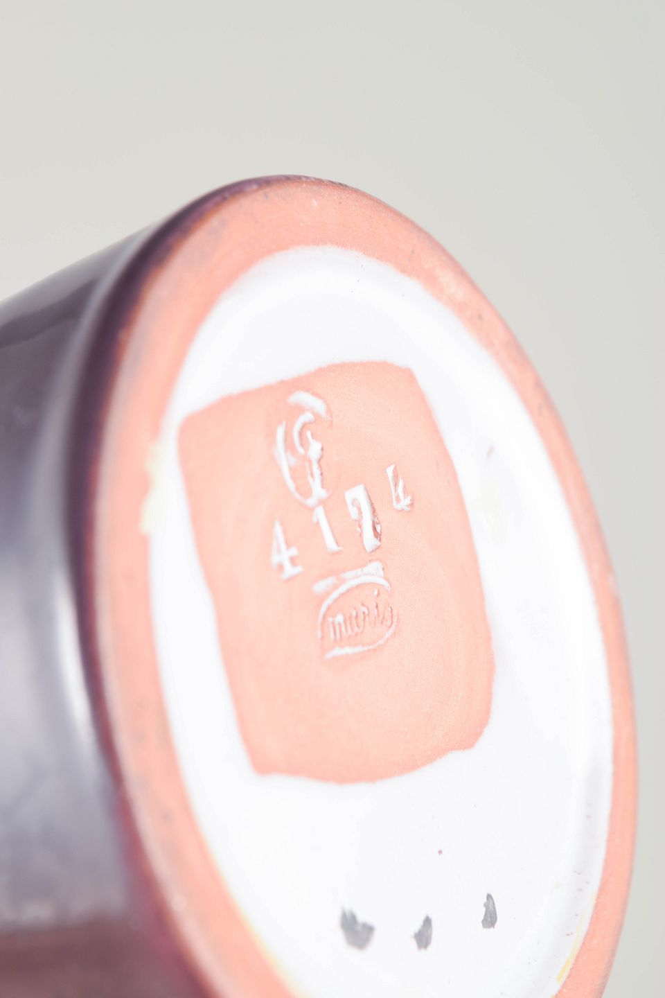 Sculptural conical vase in deep purple glaze with a fluted, bowl-shaped opening in contrasting light tones. A striking decorative 1960s design with Simmulson’s characteristic expression.