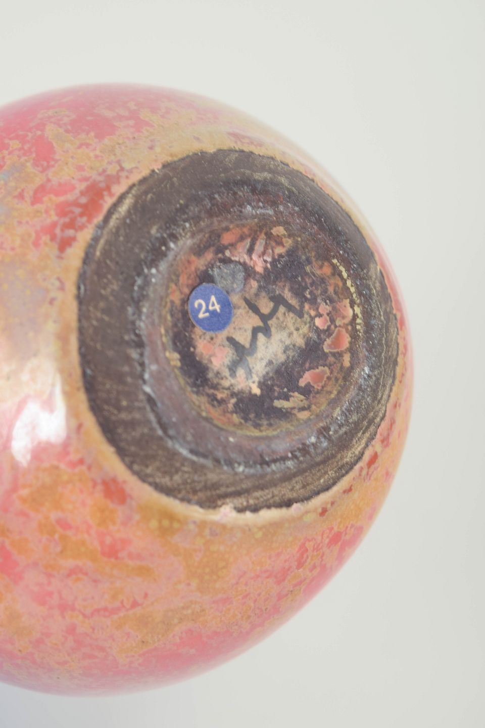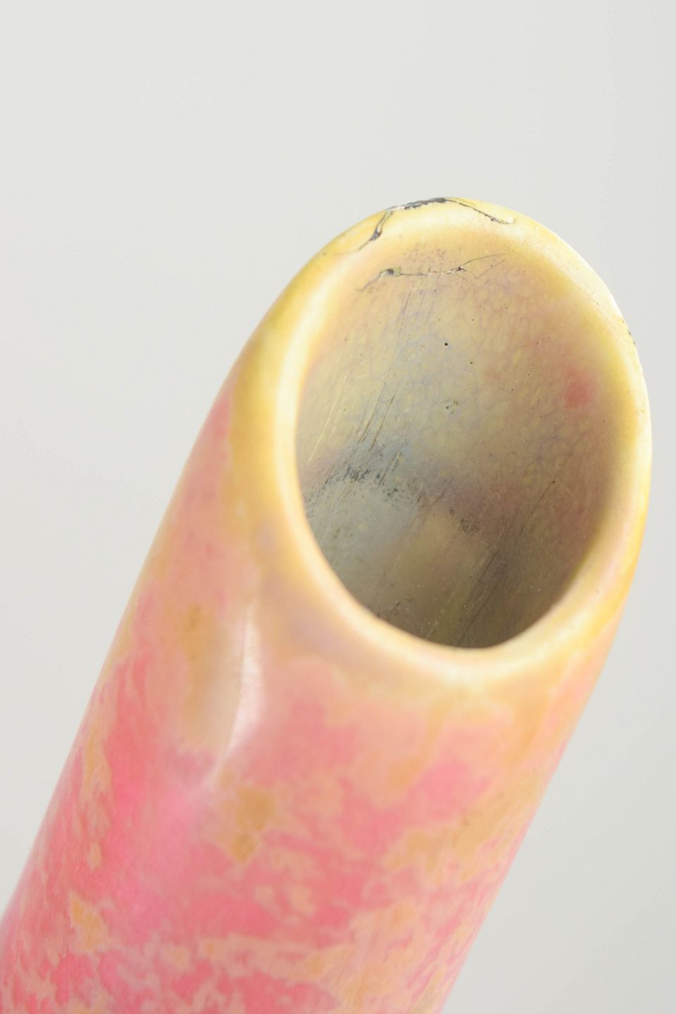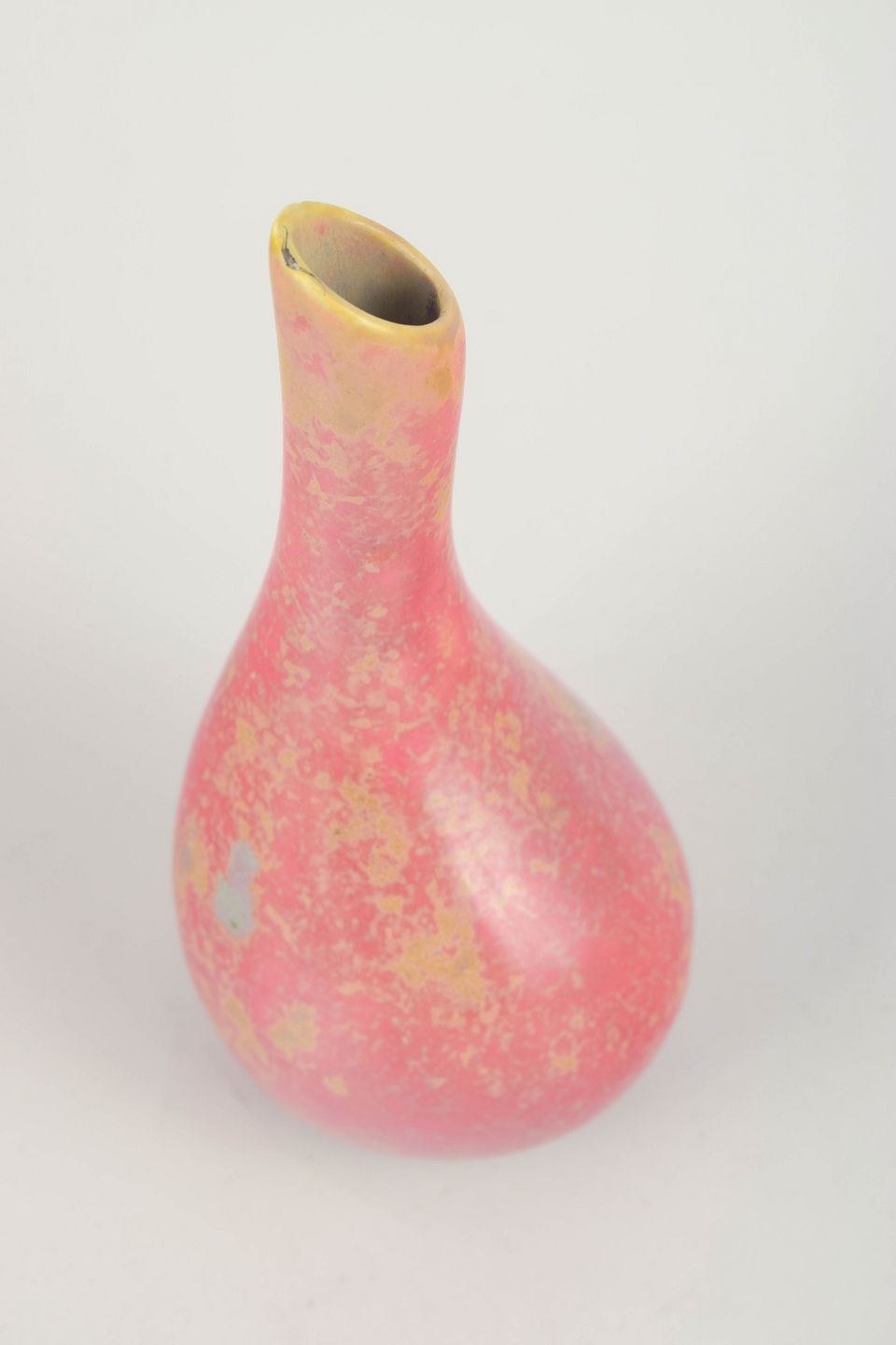 Elegant drop-shaped ceramic vase with a characteristic marbled pink and yellow glaze. The slender neck and rounded body give the piece a sculptural presence.