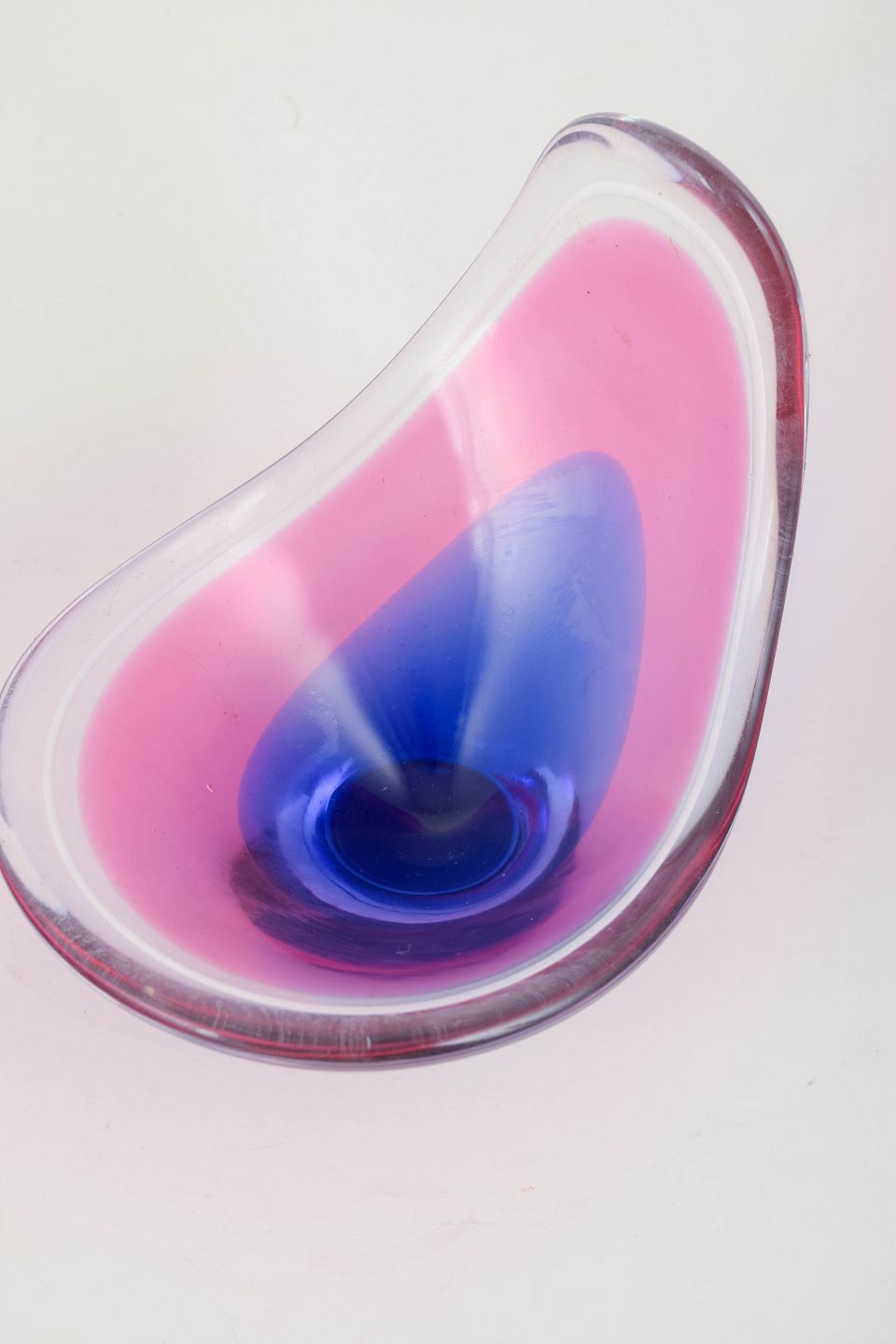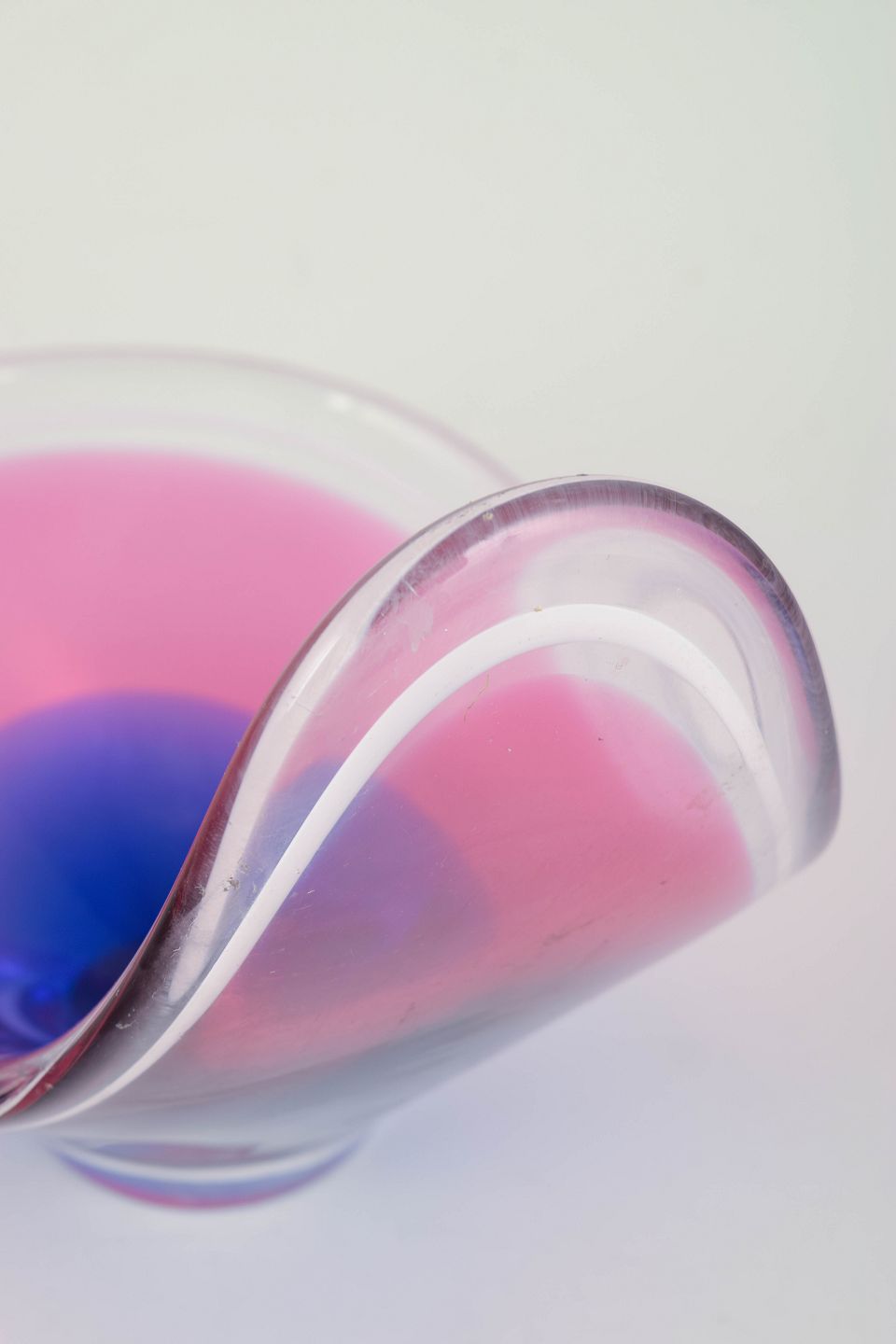 Elegant “Coquille” bowl in layered art glass with pink and blue interior tones, featuring an organically lifted form encased in clear glass.
