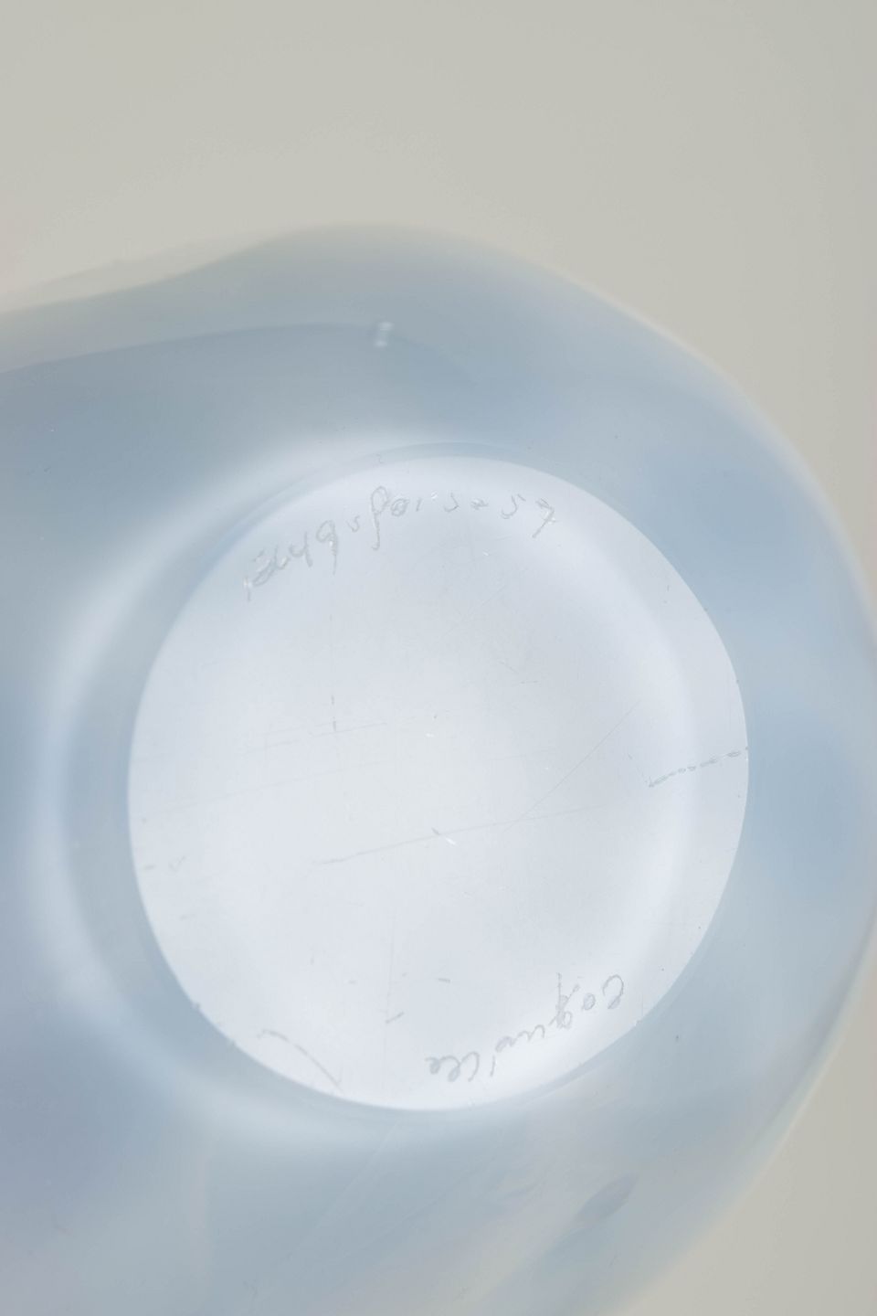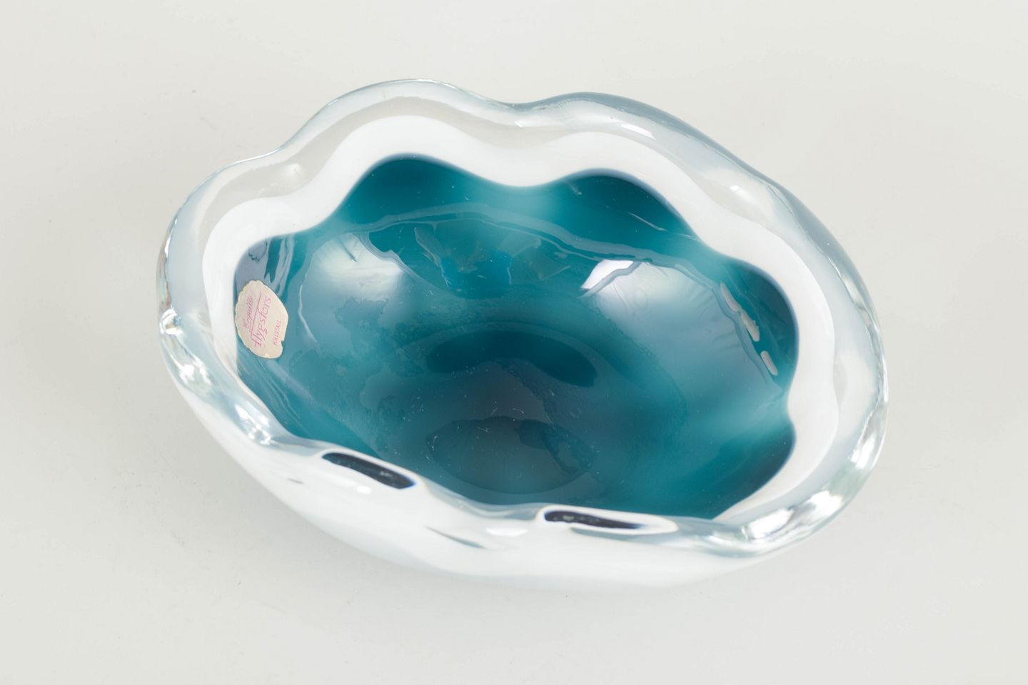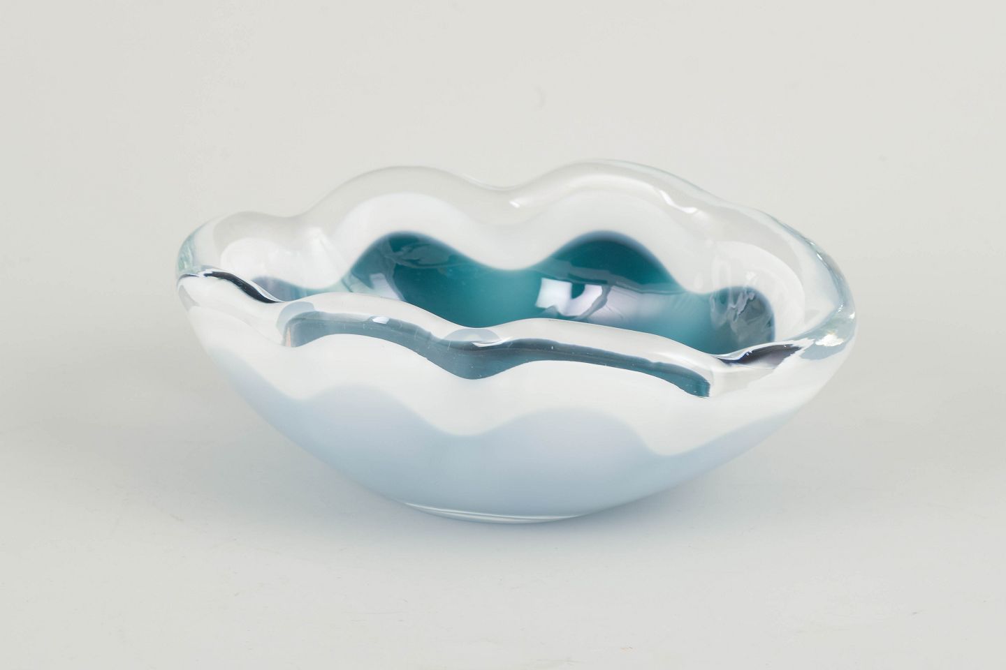 Organic “Coquille” bowl in layered art glass with turquoise and white interior colouring encased in clear glass.