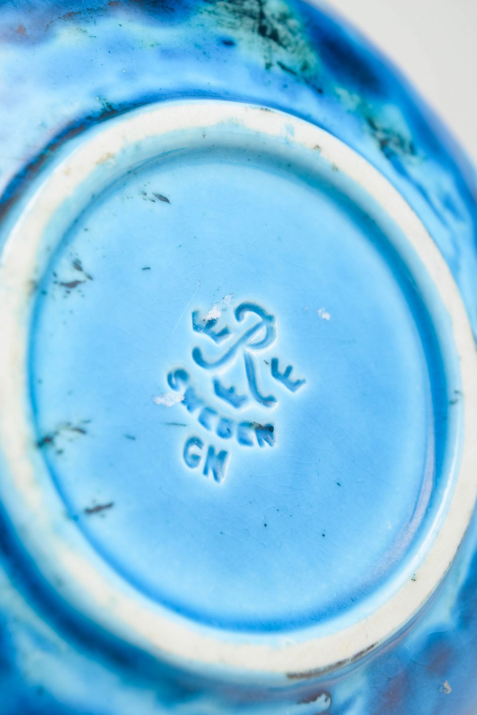 Hand-shaped ceramic dish with a vibrant turquoise-blue glaze and incised stylised floral decoration. A characteristic example of Nylund’s organic design language and colourful expression from the period.