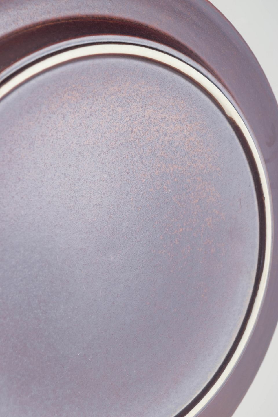 Four dinner plates in dark brown stoneware from Arabia’s iconic “Ruska” series, known for its durable chamotte body and the deep matte iron-brown glaze with natural variations.