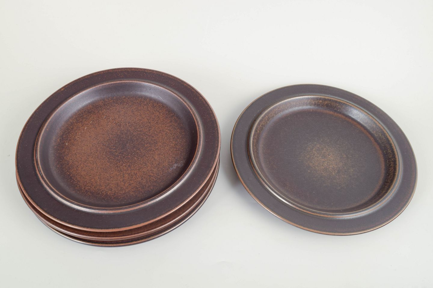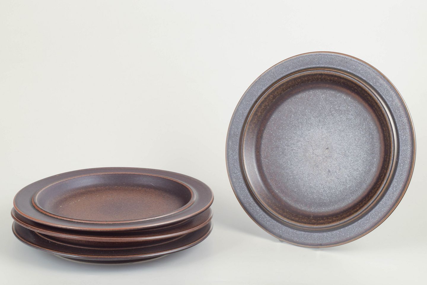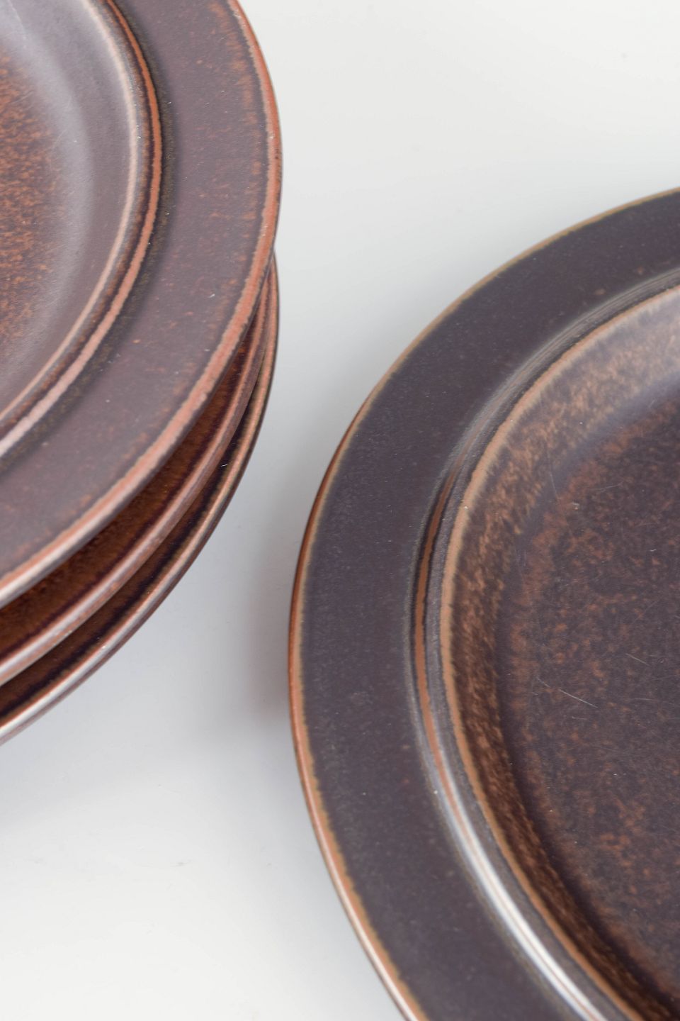 Four dinner plates in dark brown stoneware from Arabia’s iconic “Ruska” series, known for its durable chamotte body and the deep matte iron-brown glaze with natural variations.