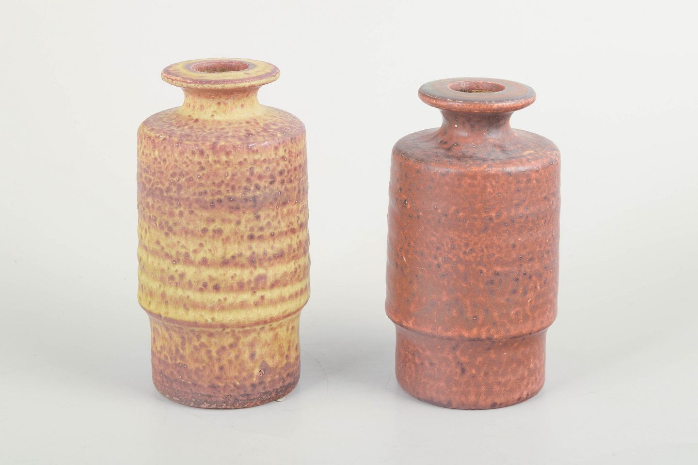 Pair of hand-thrown stoneware vases with the characteristic Mobach texture and matte, nuanced glazes in yellow and reddish-brown tones. The cylindrical forms and tactile surfaces are typical of the workshop’s modernist aesthetic.
