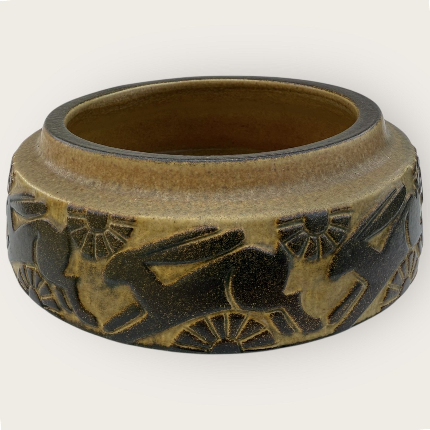 Bornholm pottery, Michael Andersen, Large Bowl with jumping hares, diameter 23.5cm, height 8cm, # L429 *Good condition*