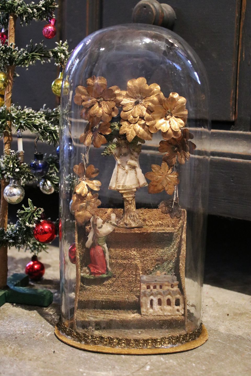 Antique, religious glass globe with Madonna figure and flower decorations...