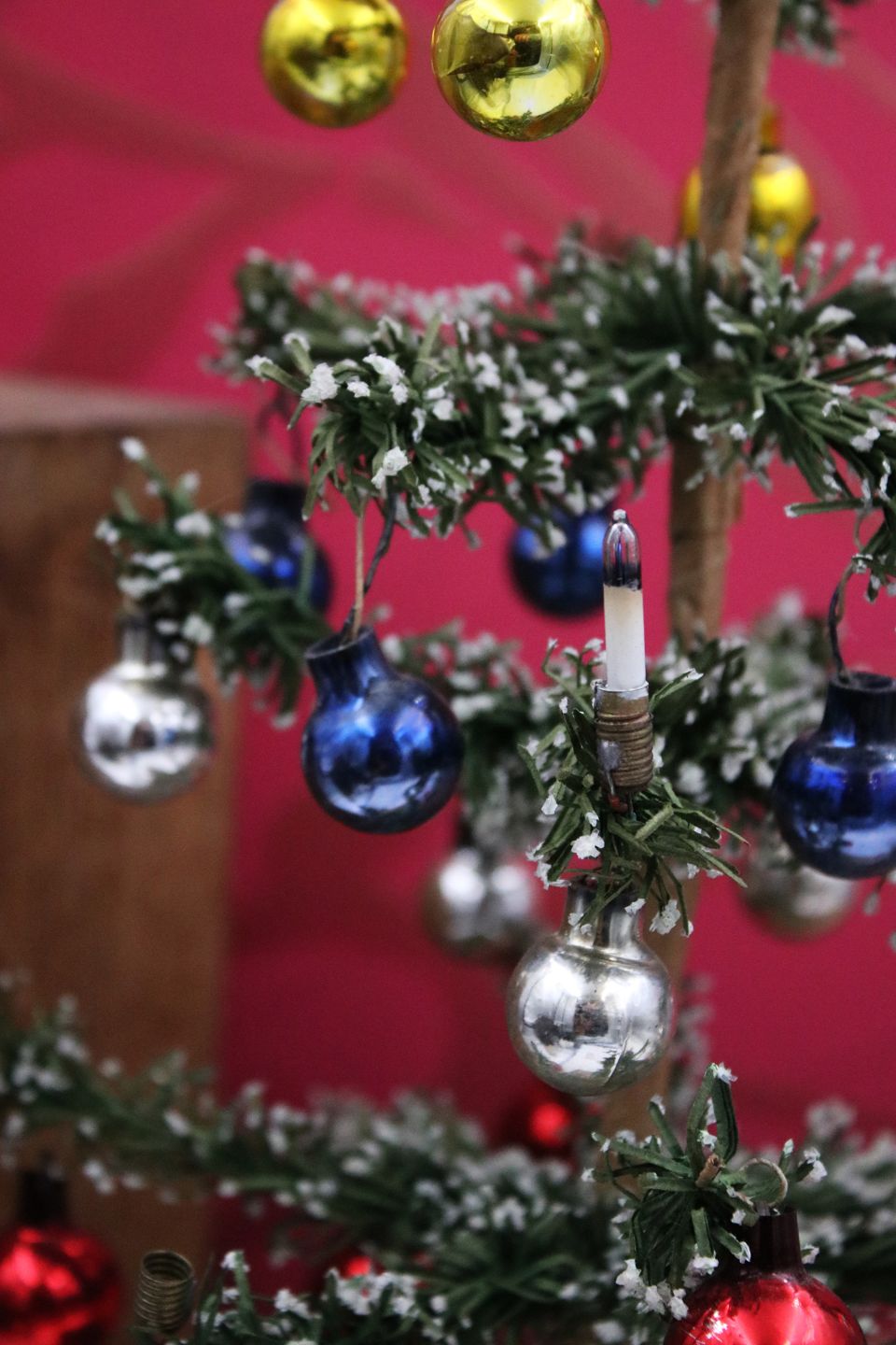 Antique miniature Christmas tree, decorated with lots of small colored Christmas glass balls...
