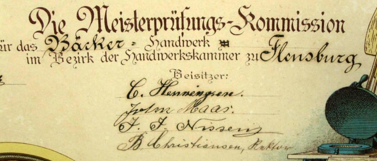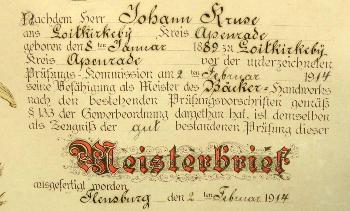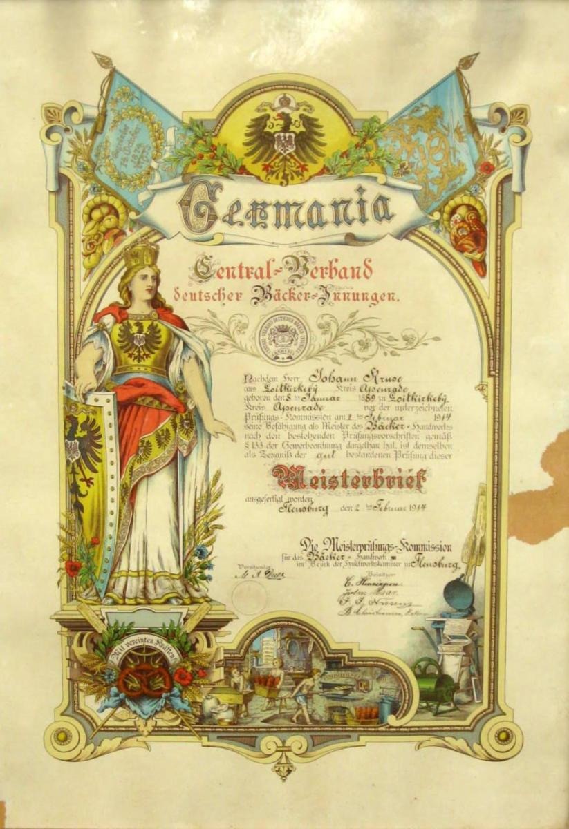 Master baker letter Løjt Kirkeby 1914. Master baker Johan Kruse. Lithography. 66 x 48 cm. In mahogany frame.