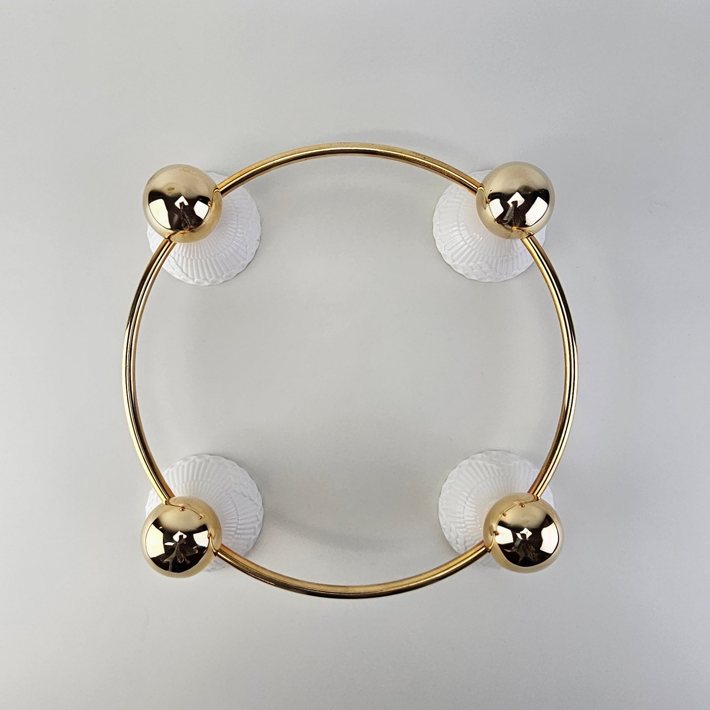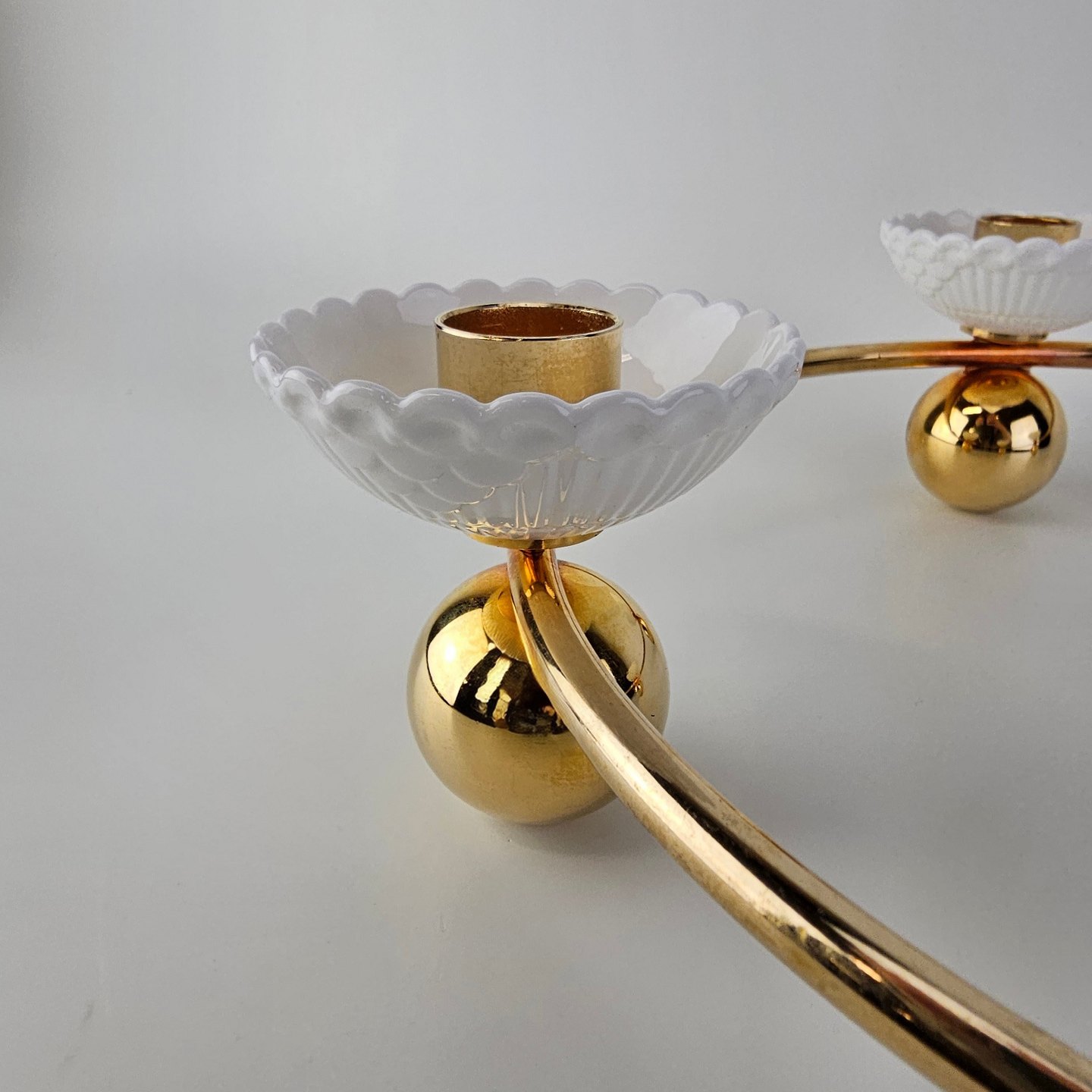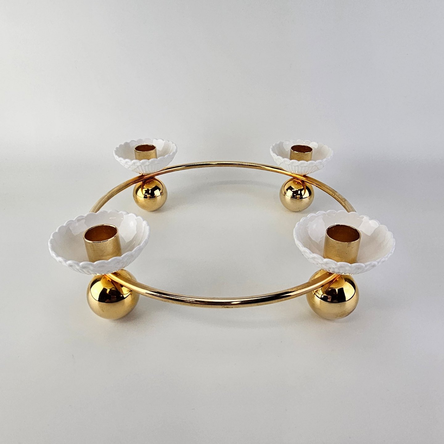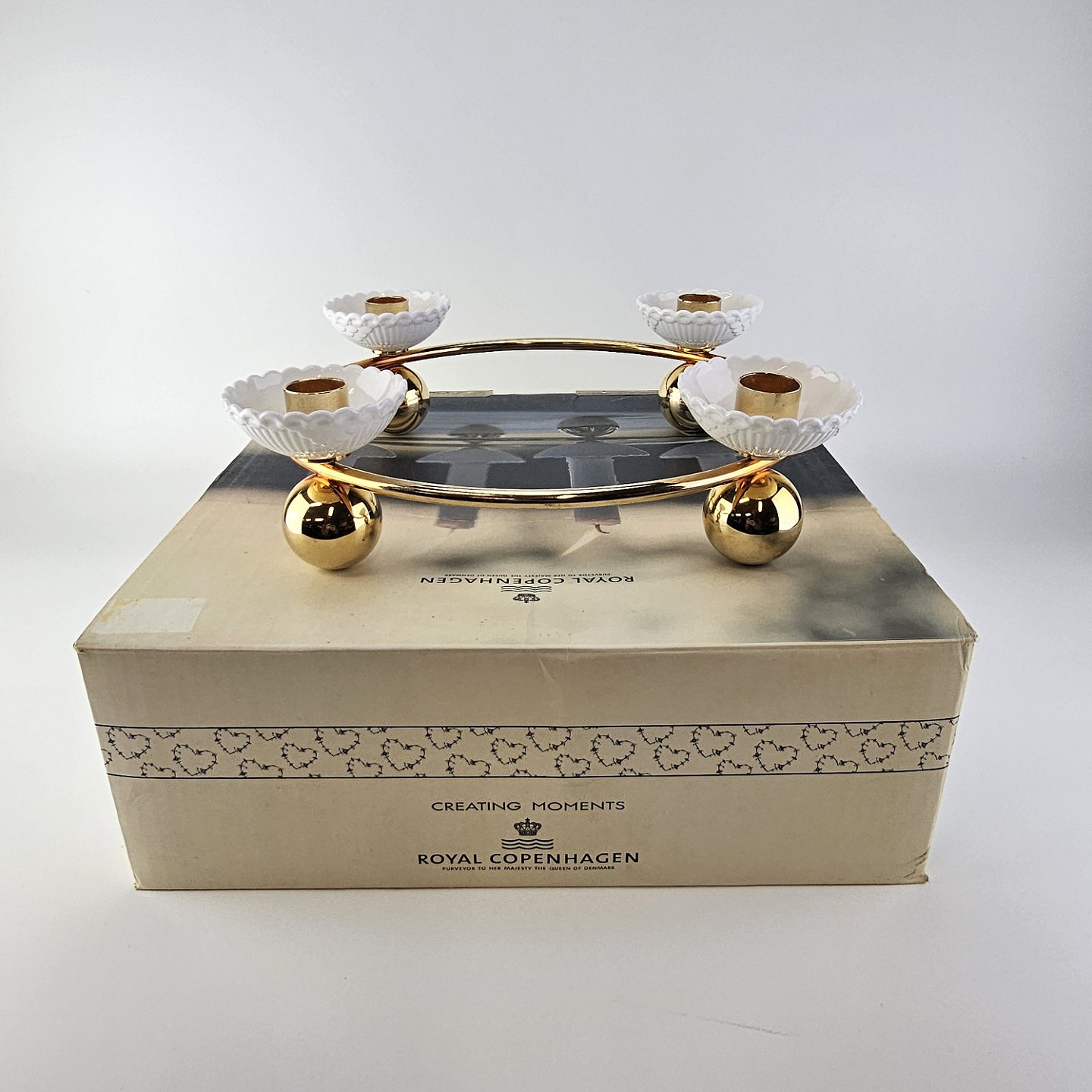 Text available in Danish: Rund lysestage i forgyldt messing med plads til fire lys i små hvide skåle af kongeligt porcelæn. Stagen er fra serien Creating Moments og kommer i original kasse