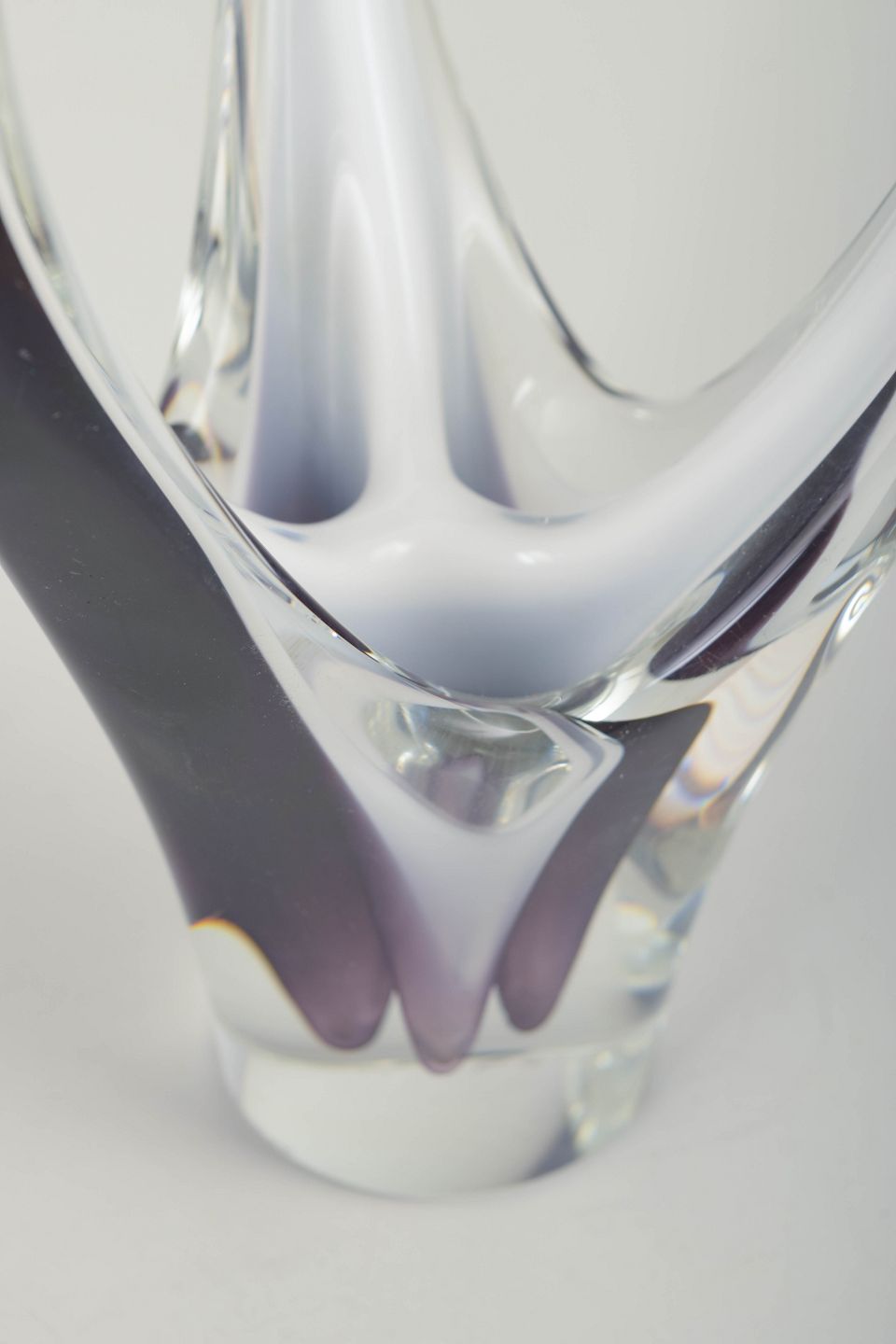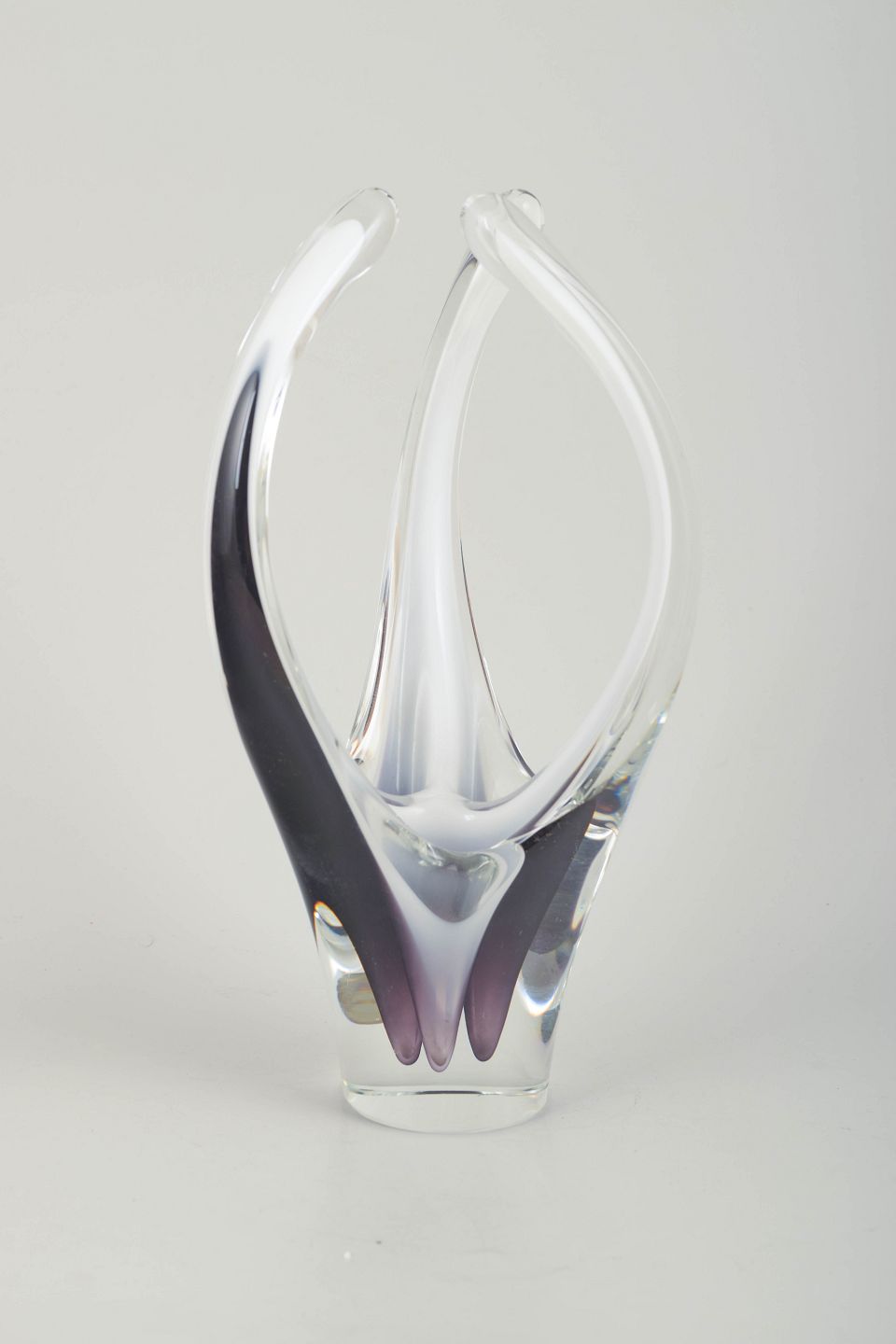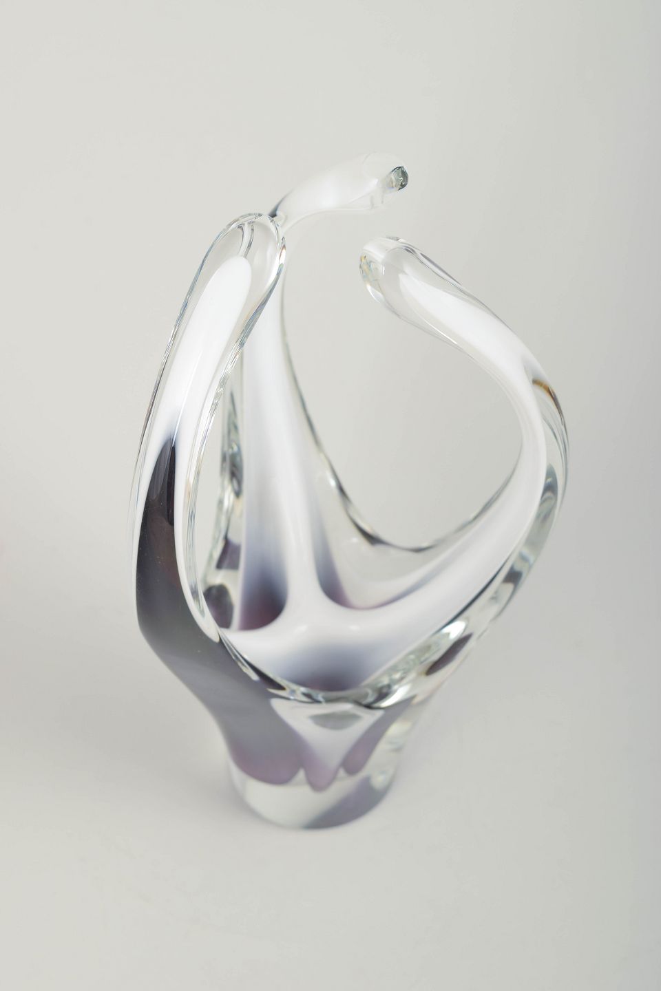 Sculptural, organically shaped art-glass vase in clear glass with elegant layers of violet and white. Mouth-blown in the classic upward-flowing Coquille form, with the two upper arms joining in a graceful arc.
