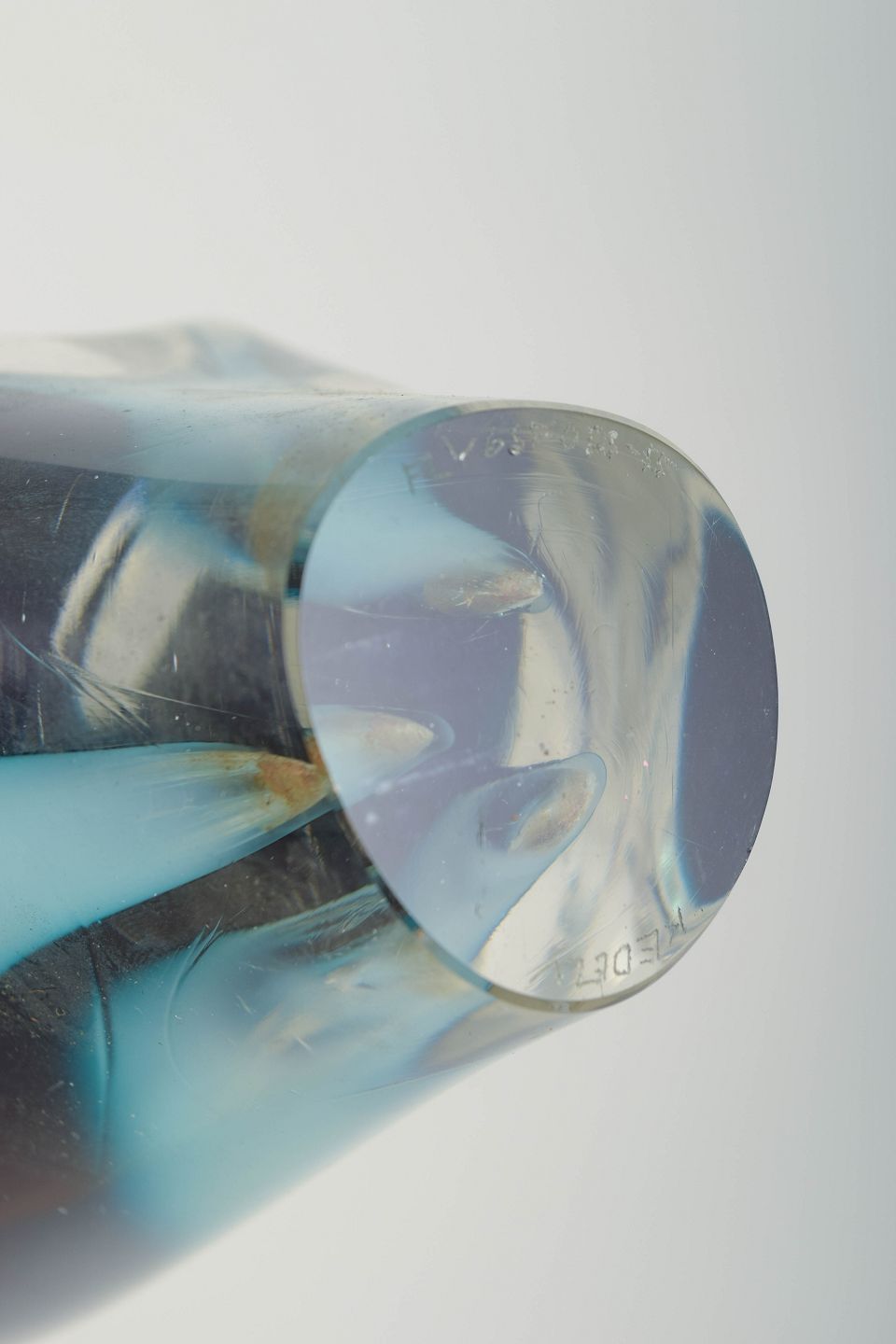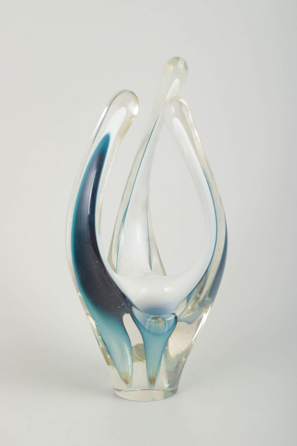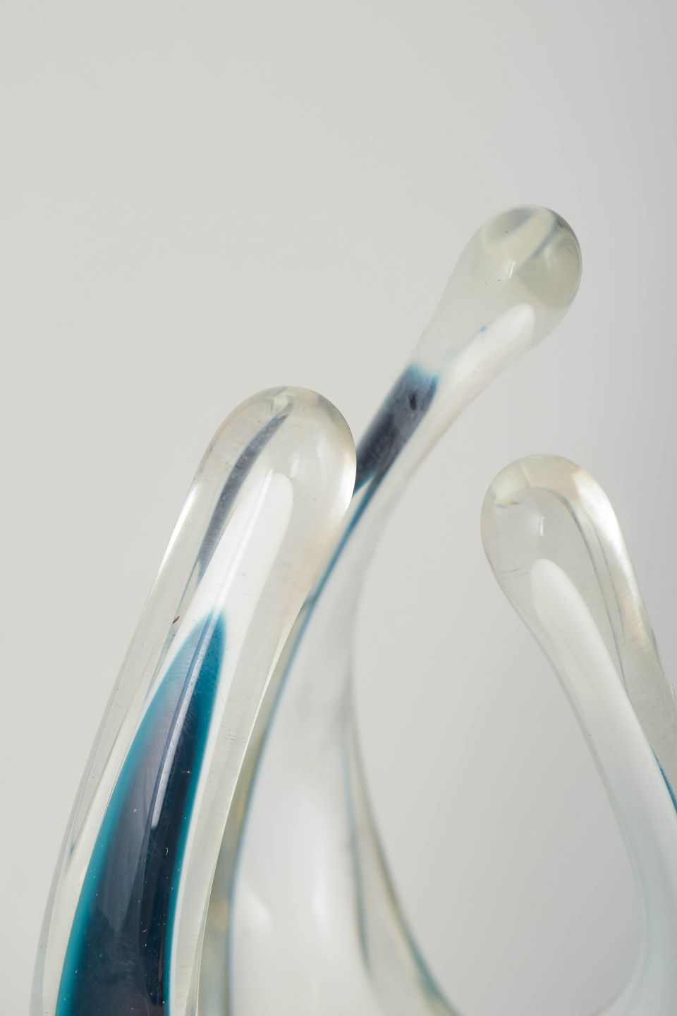 Sculptural, organically shaped art-glass vase in clear glass with layered turquoise, deep blue, and white tones. Mouth-blown with the characteristic upward sweeping arm/flame shapes from the early Coquille production. Elegant colour layering with a strong mid-century aesthetic.