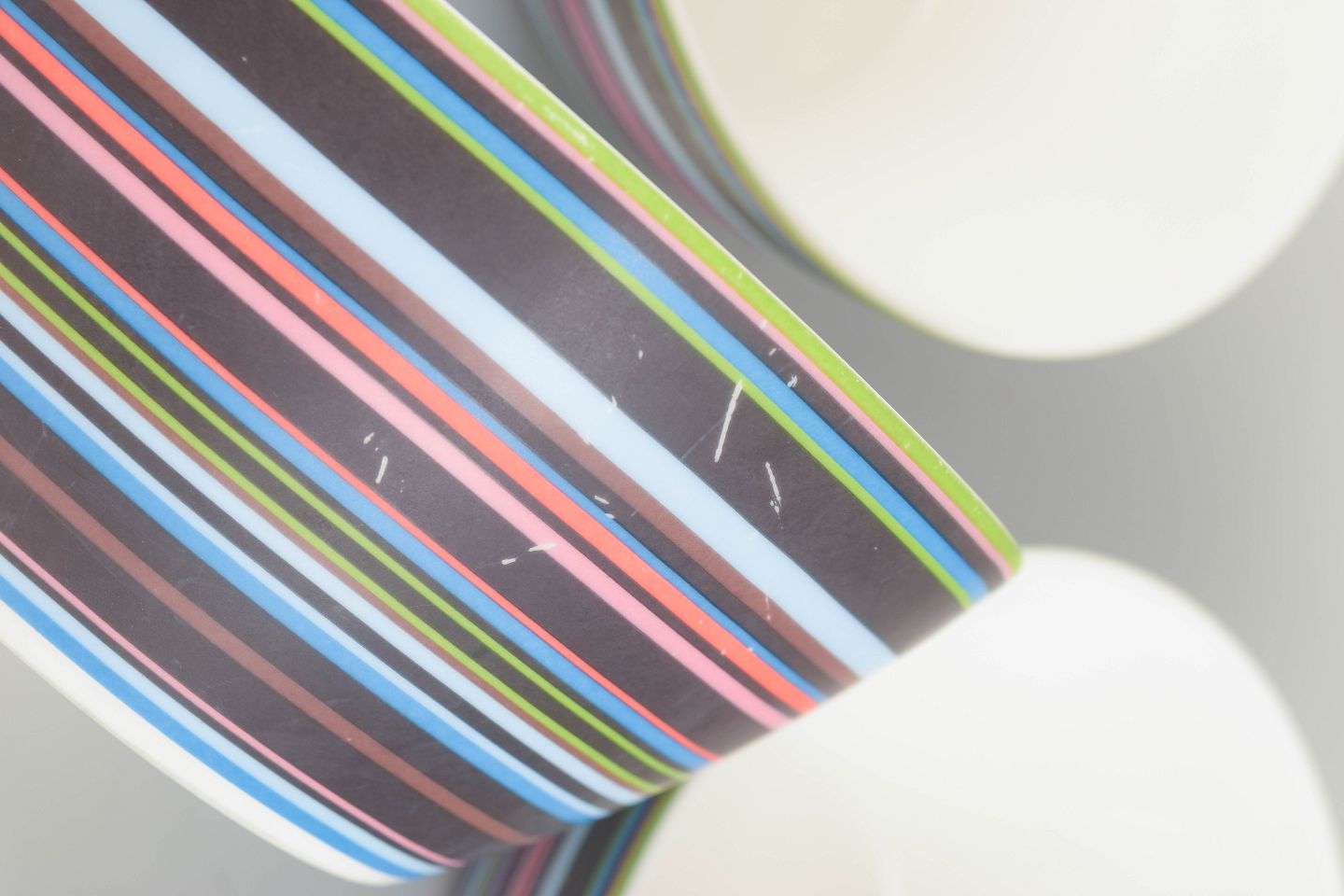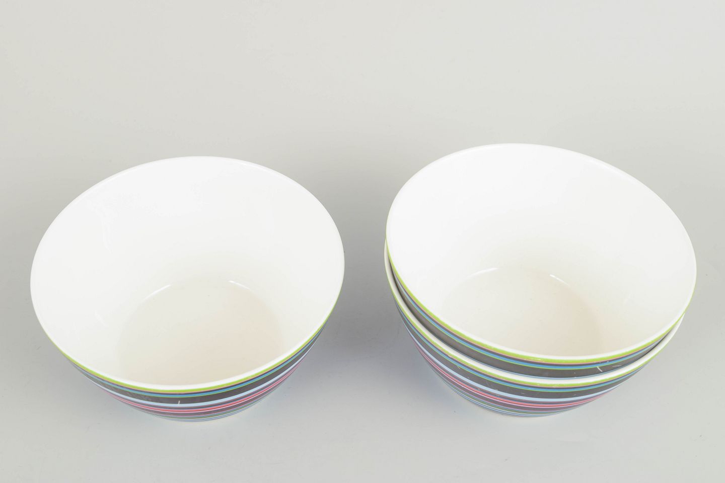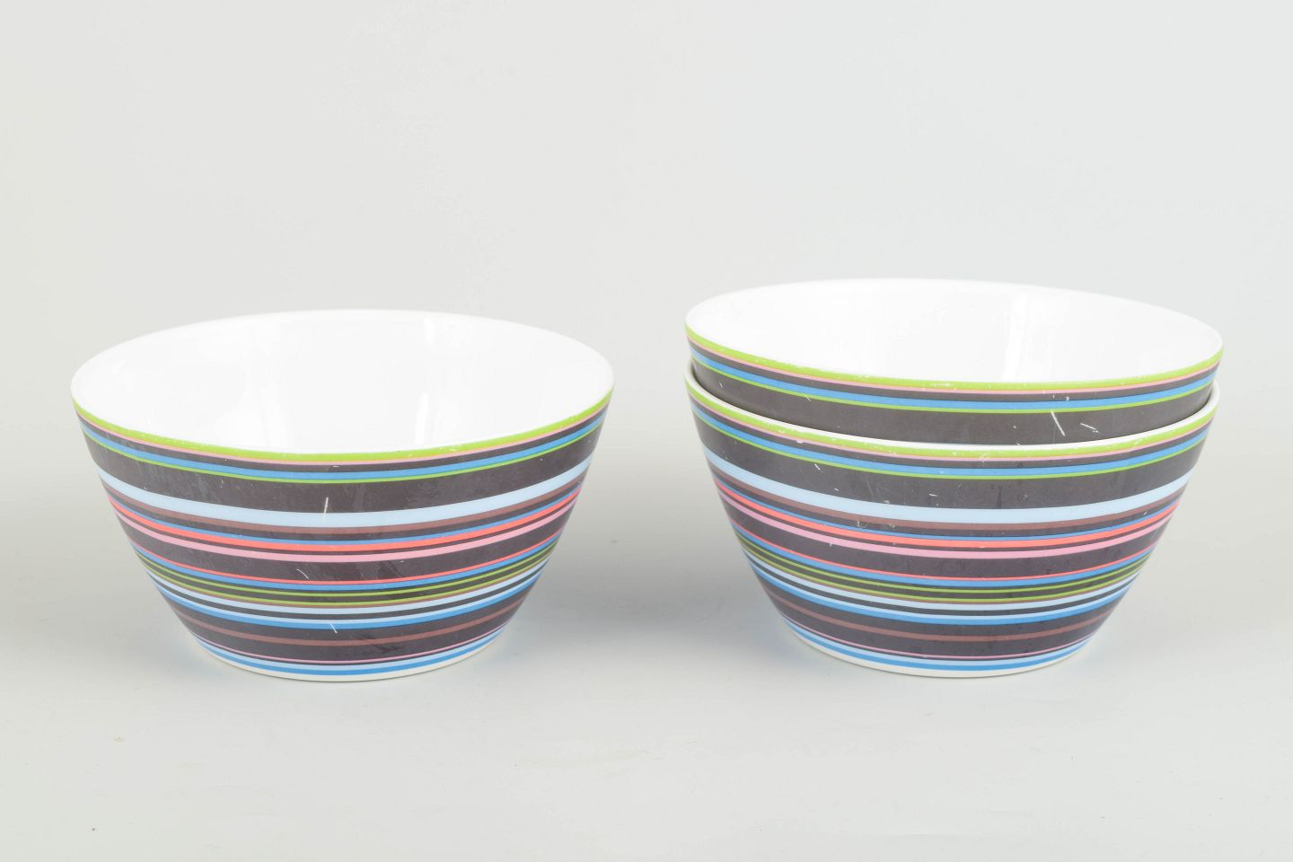 Three colourful porcelain bowls from the iconic Origo series, decorated with the characteristic multicoloured horizontal stripes.