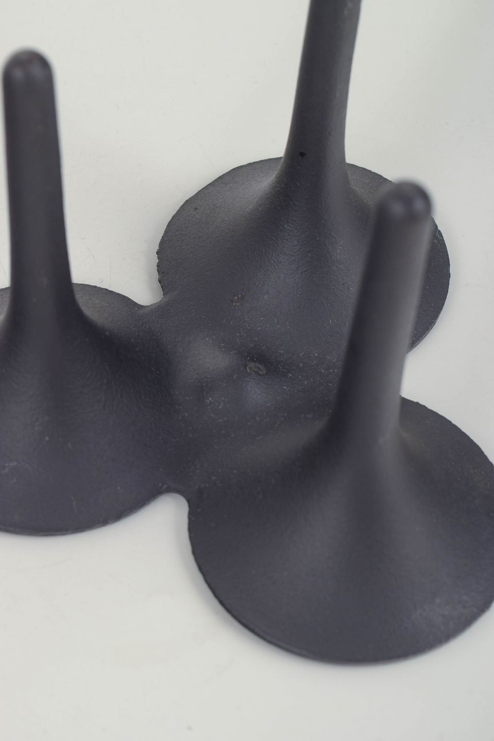 Sculptural, organically shaped candlestick in black-coated cast iron, executed in Quistgaard’s characteristic modernist idiom. The three tapered legs meet at a unified top with three shallow bowl-shaped holders.