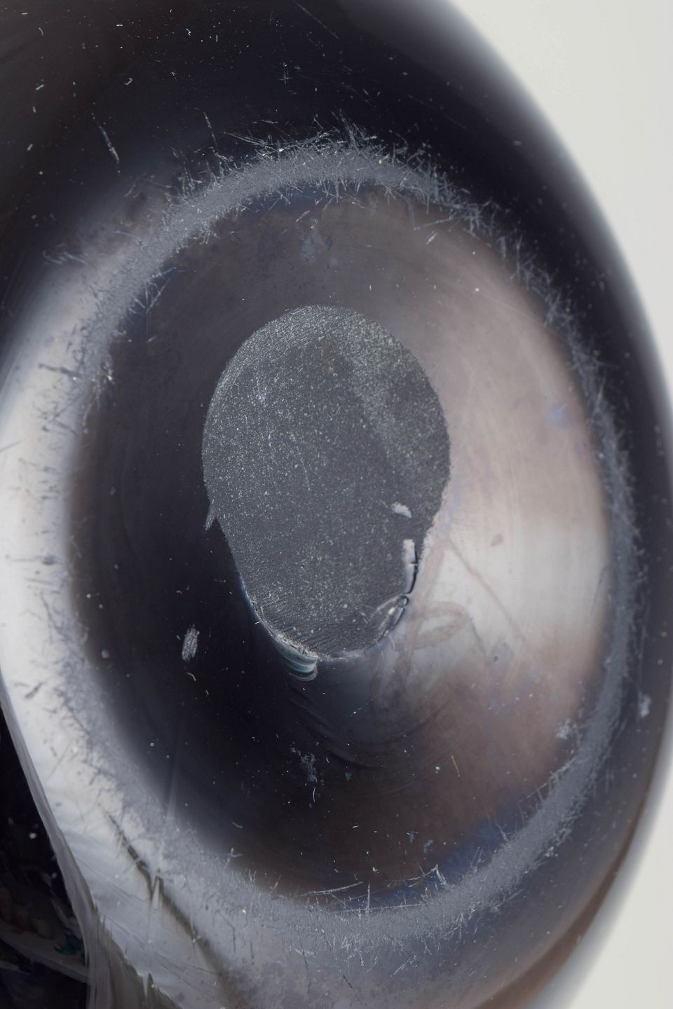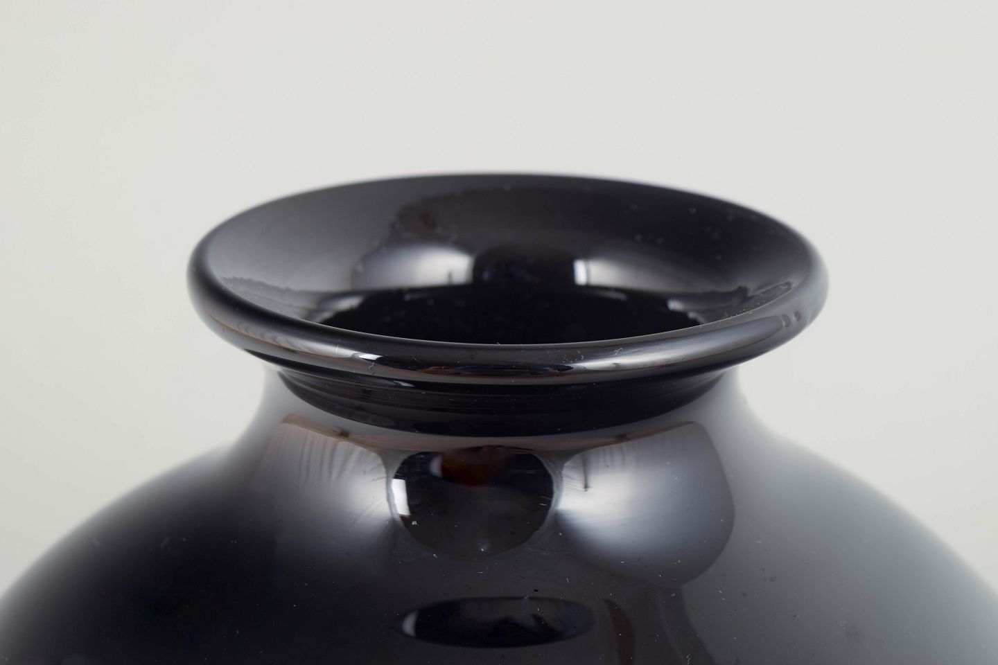 Mouth-blown Art Deco glass vase in a deep, near-black tone with a rounded body and gently flared rim. Unsigned, as is common for the period and for many of Notini’s works for Pukeberg.