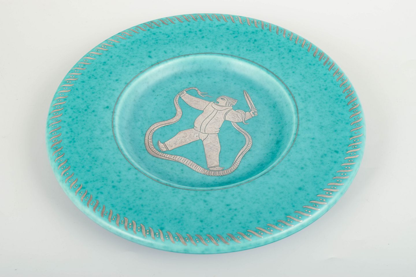 Large decorative dish in the iconic turquoise Argenta glaze with silver inlay. The centre features a mythological figure rendered in Kåge’s characteristic linework, surrounded by a silver-inlaid braided border. A striking and less common Argenta piece in a substantial format.