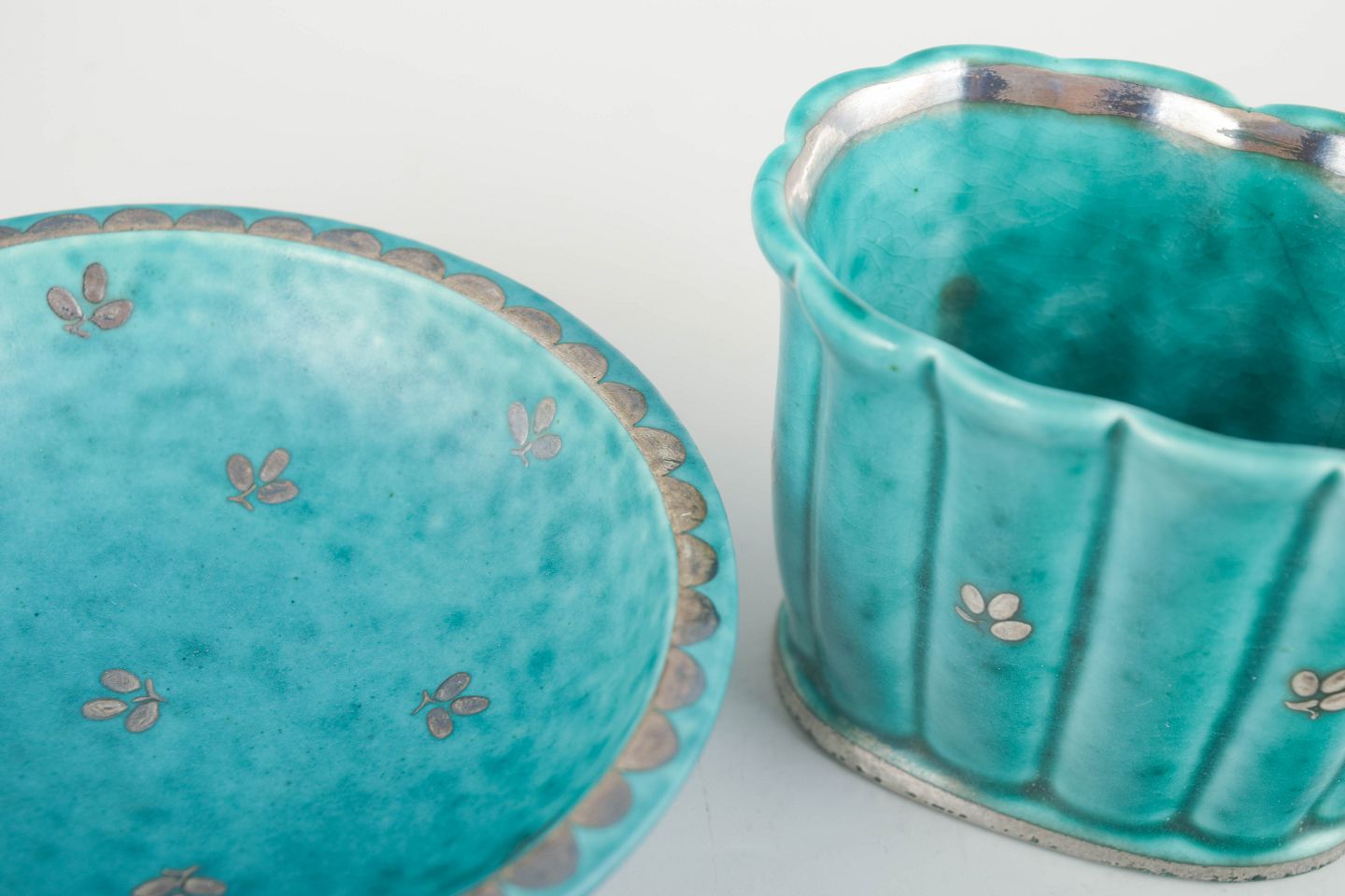 Bowl and small vase in the classic turquoise glaze with silver inlays, characteristic of Kåge’s iconic Argenta work for Gustavsberg. Elegant small formats with clear studio craftsmanship.