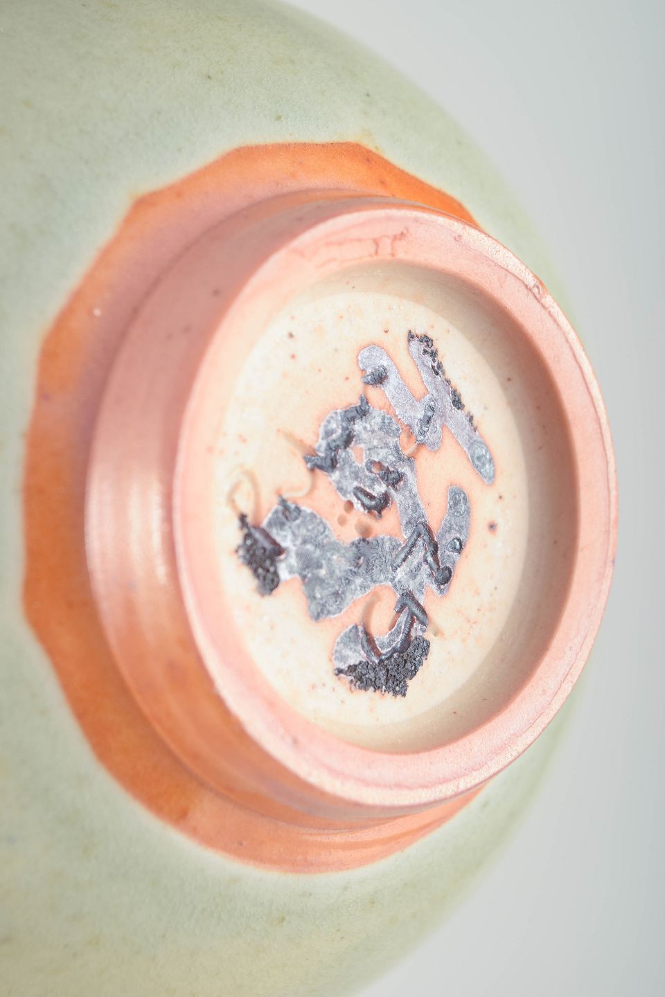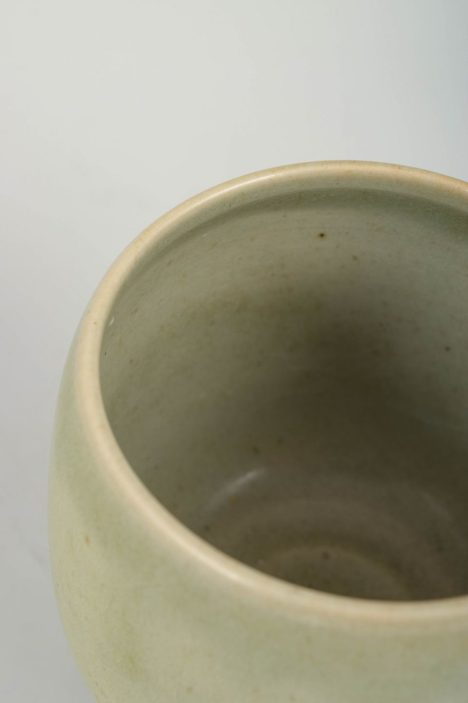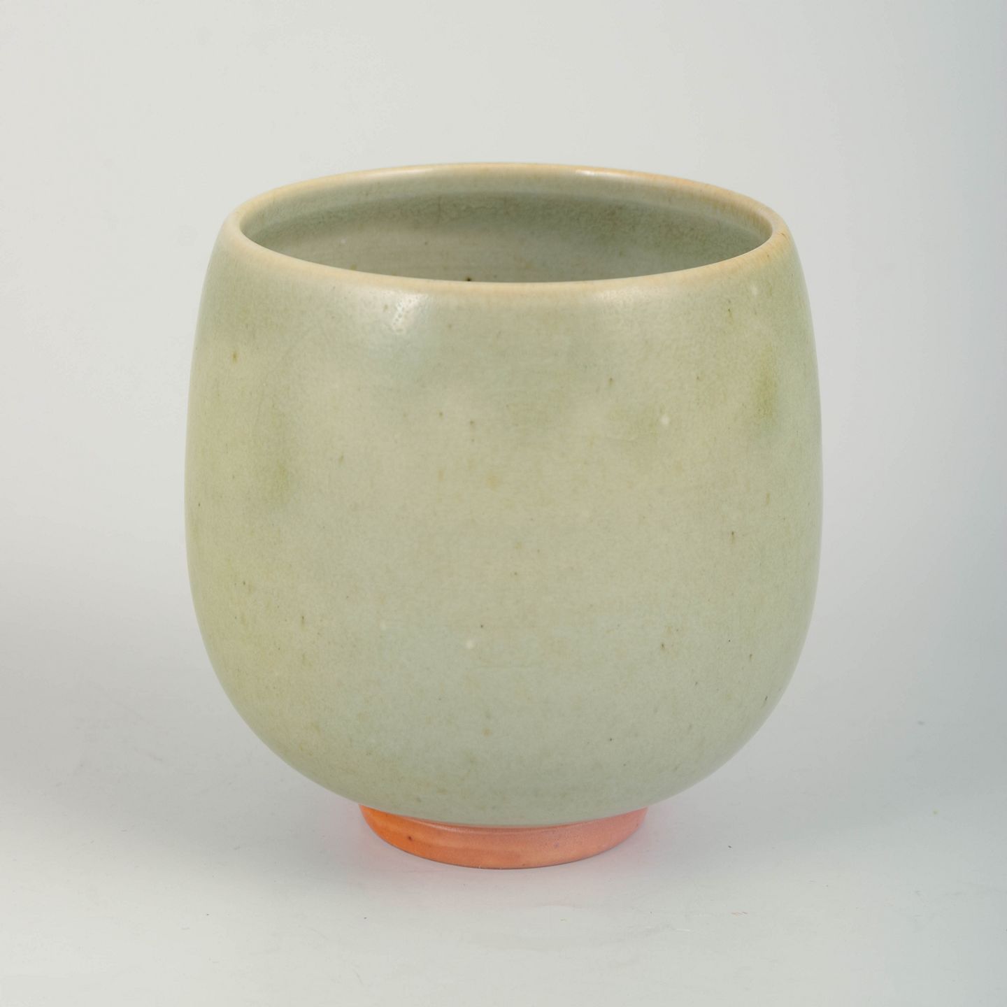 Beautiful hand-thrown unique stoneware vase with a softly rounded form, finished in a subdued, green-tinged celadon glaze with a smooth, even surface. The warm terracotta tone at the foot creates a subtle contrast, characteristic of Palm’s simple and material-focused expression. An elegant example of his more minimal studio work from the period.