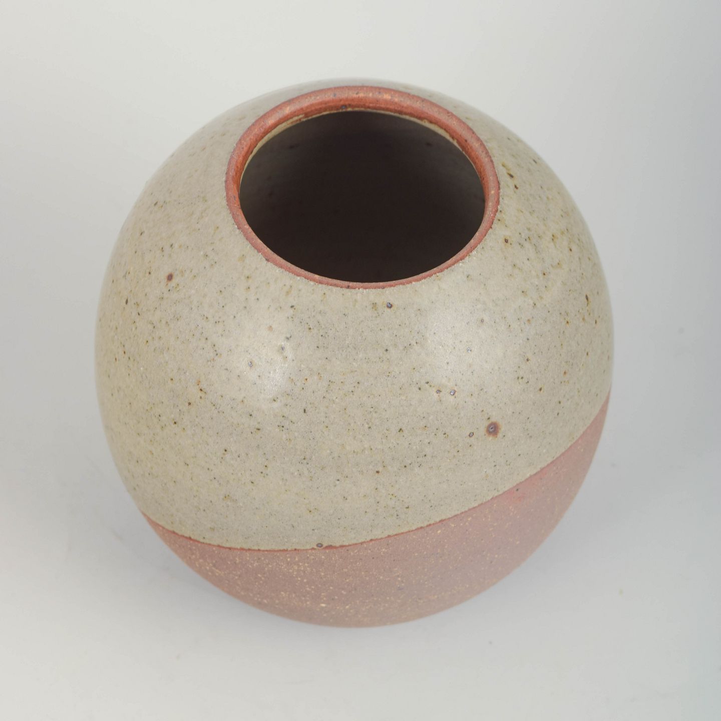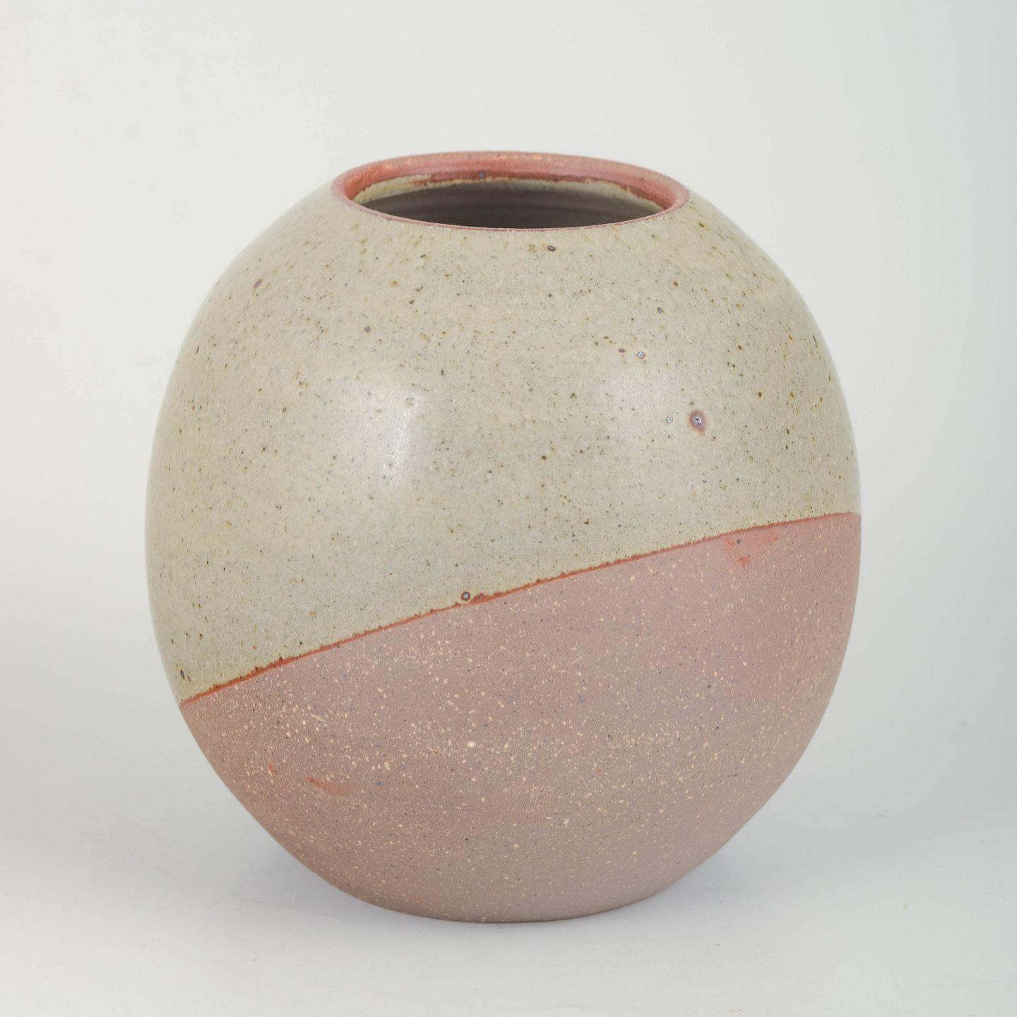 Hand-thrown stoneware vase with a rounded, organic form. Executed in Palm’s characteristic tactile style with a two-tone matte glaze: the upper section in a pale chalk-like shade and the lower section in muted rose. A refined and balanced example of Palm’s more minimalist studio work.