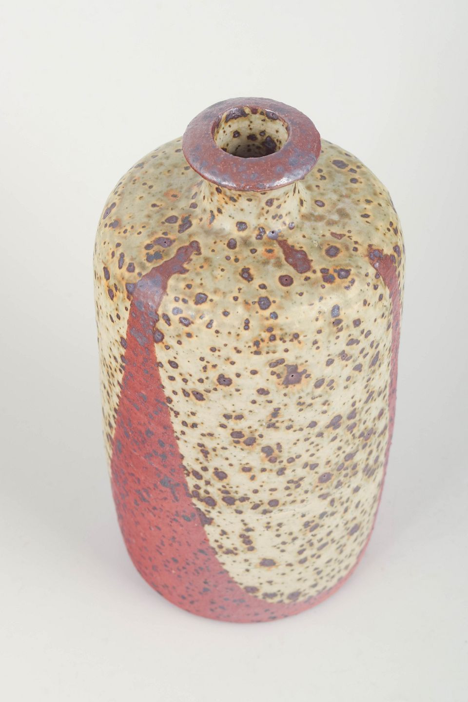Impressive hand-thrown stoneware vase by Rolf Palm, produced in his studio in Mölle. Cylindrical shape with a slightly tapered neck and a distinctive, heavily textured surface. The glaze is typical of Palm: a volcanic, tactile expression in cream, red and brown tones.