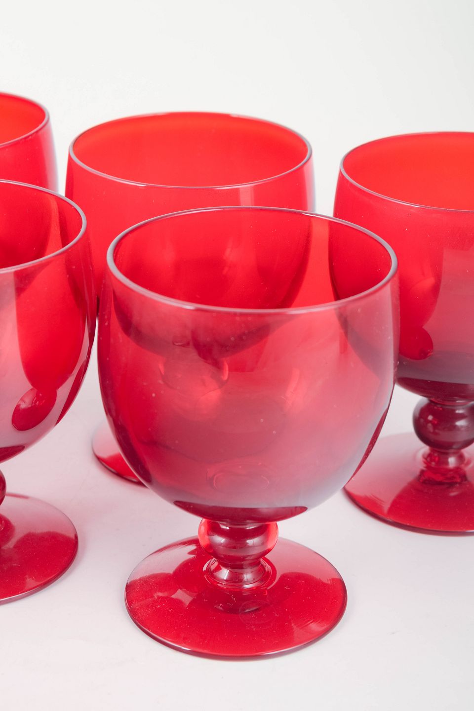 Set of six ruby-red red wine glasses with rounded bowls and profiled stems. The deep red colour is characteristic of Reijmyre’s mid-century production.