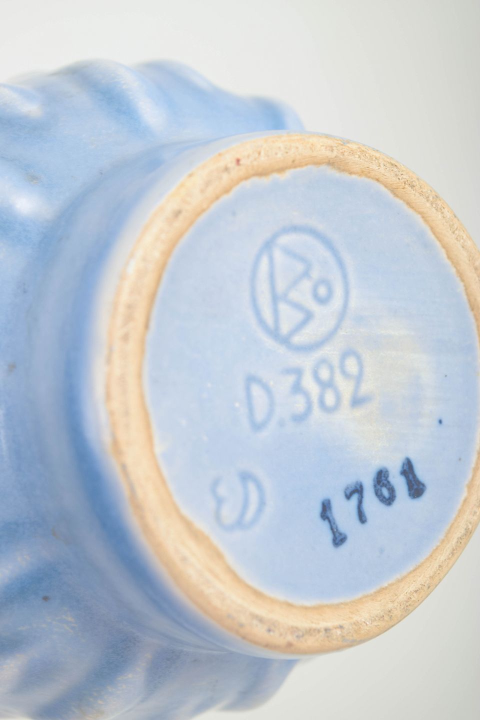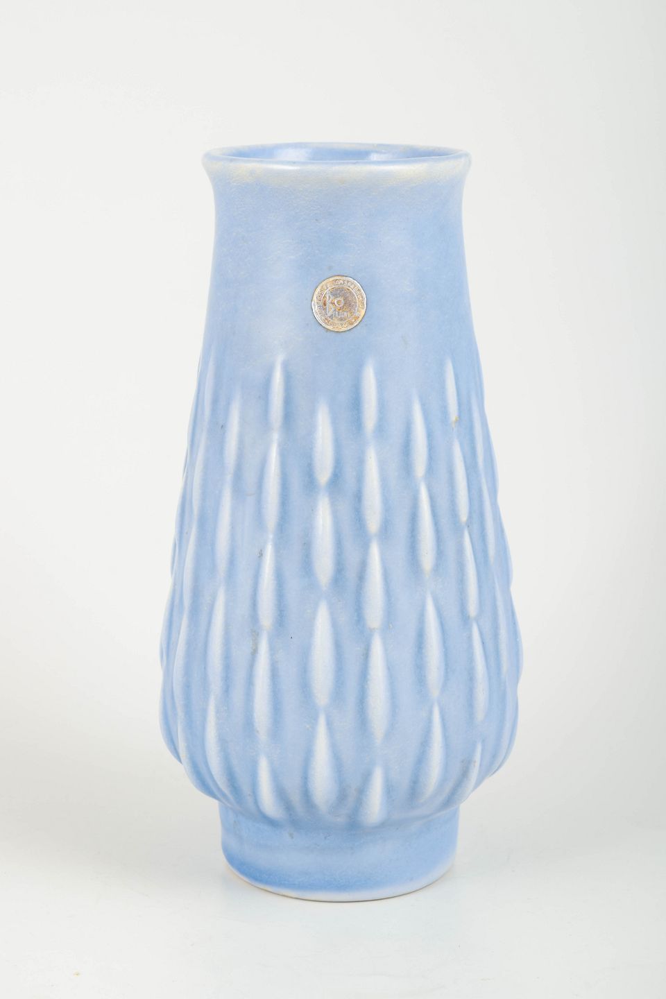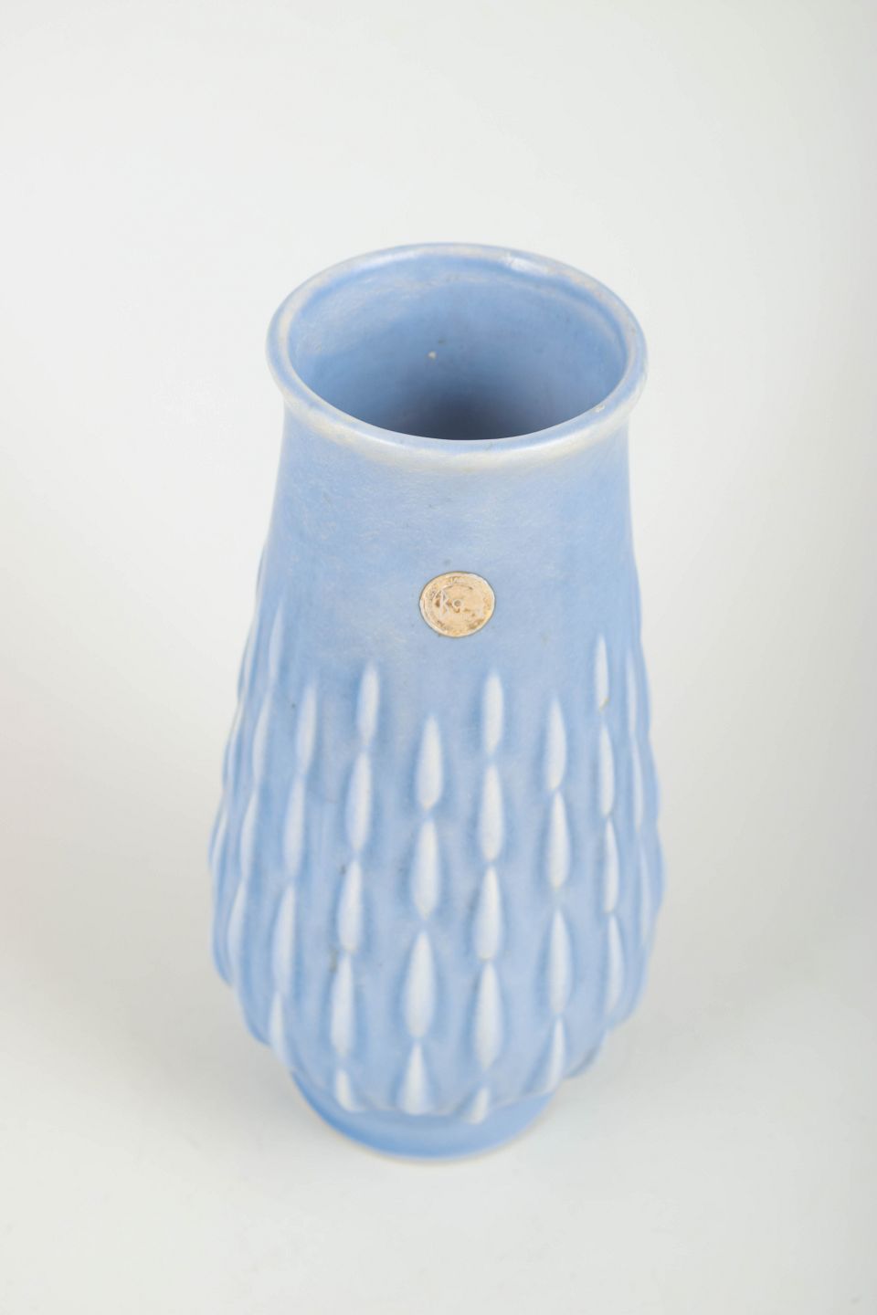 Handmade faience vase in light blue glaze with relief decoration and original Bo Fajans label preserved. Model D382. Refined cylindrical form featuring organic, droplet-inspired vertical patterns.