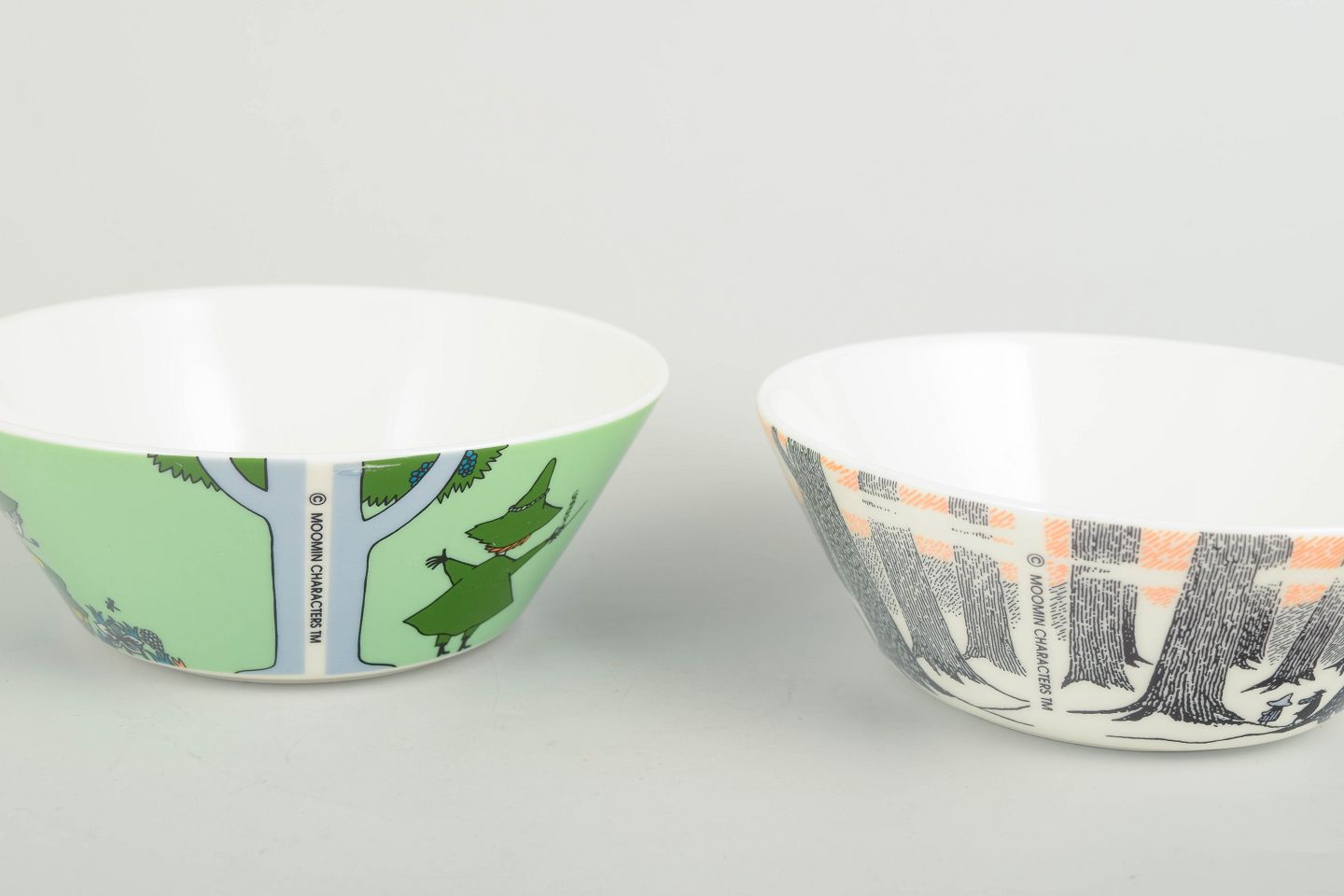 Two decorative porcelain Moomin bowls by Arabia Finland. One bowl in light green with Snufkin and a tent motif; the other features a graphic forest design in black, white and orange, inspired by Tove Jansson’s original illustrations.
