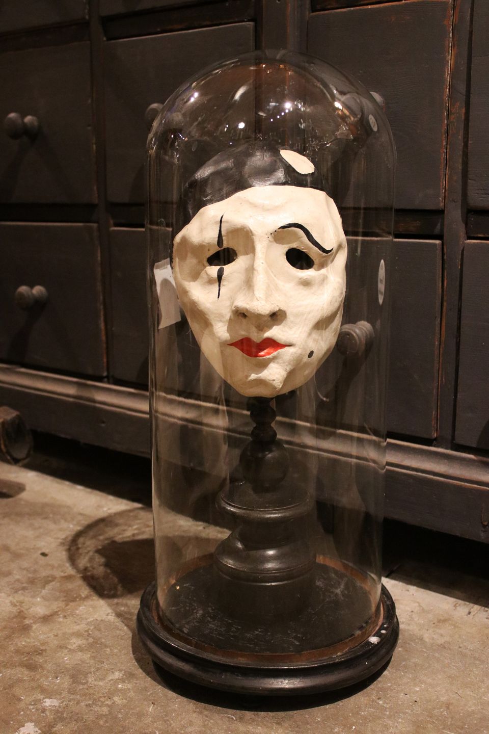 Decorative, old clown mask in painted papier-mâché mounted on old black painted wooden base. H: 44cm. W: 16cm.