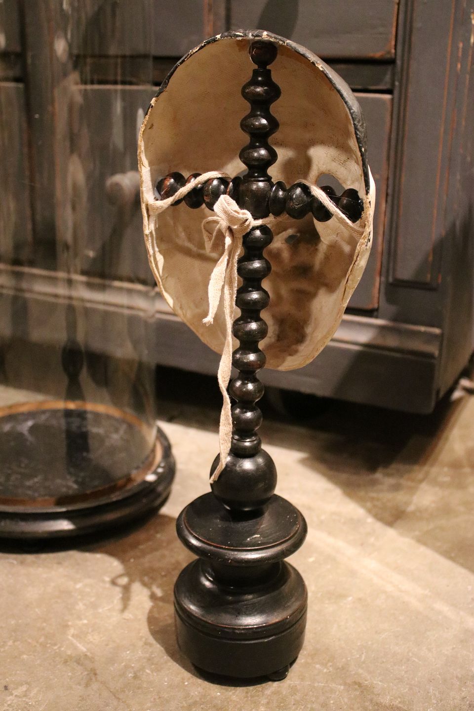 Decorative, old clown mask in painted papier-mâché mounted on old black painted wooden base...
