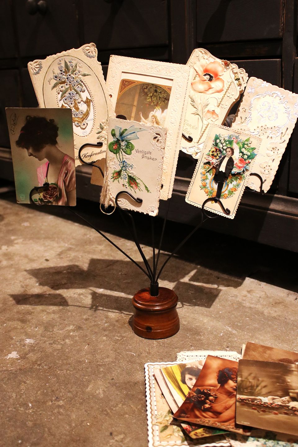 Old display for postcards, photos or business cards. The display is in black metal on a wooden base. H: 29cm. W: 35cm. (incl. 4 old cards)