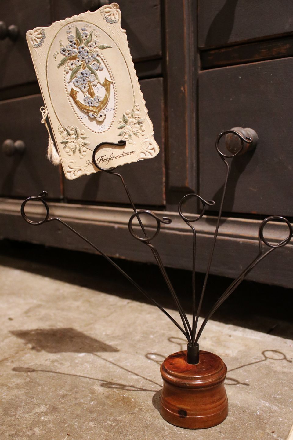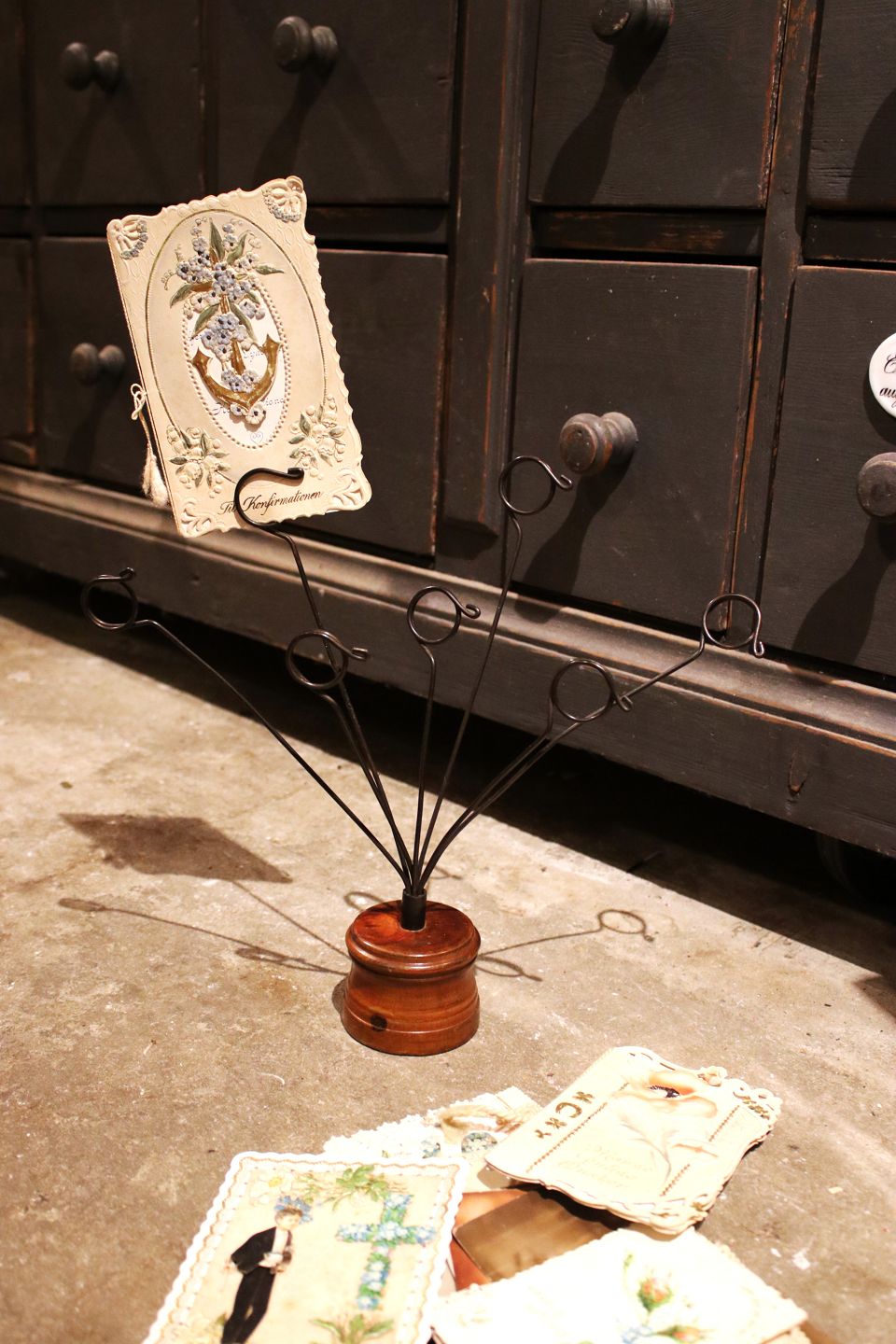 Old display for postcards, photos or business cards. The display is in black metal on a wooden base...