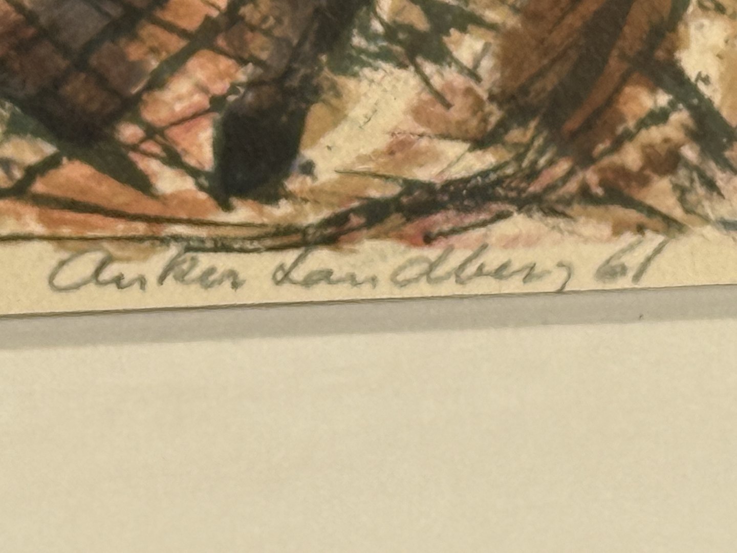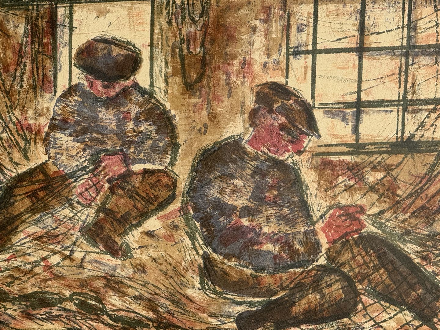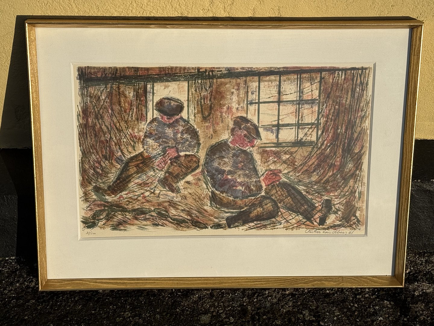 Anker Landberg, Lithograph in frame, Fishermen repairing nets, signed Anker Landberg 61 and 31/100, Dimensions with frame: 66x48cm *fine condition*