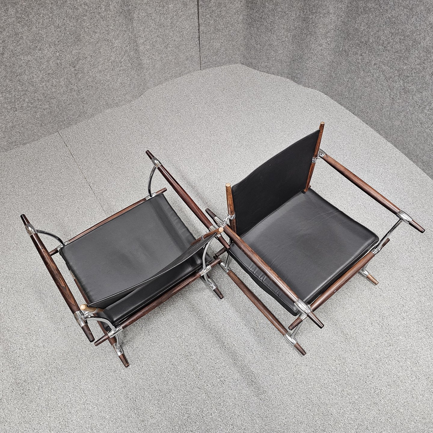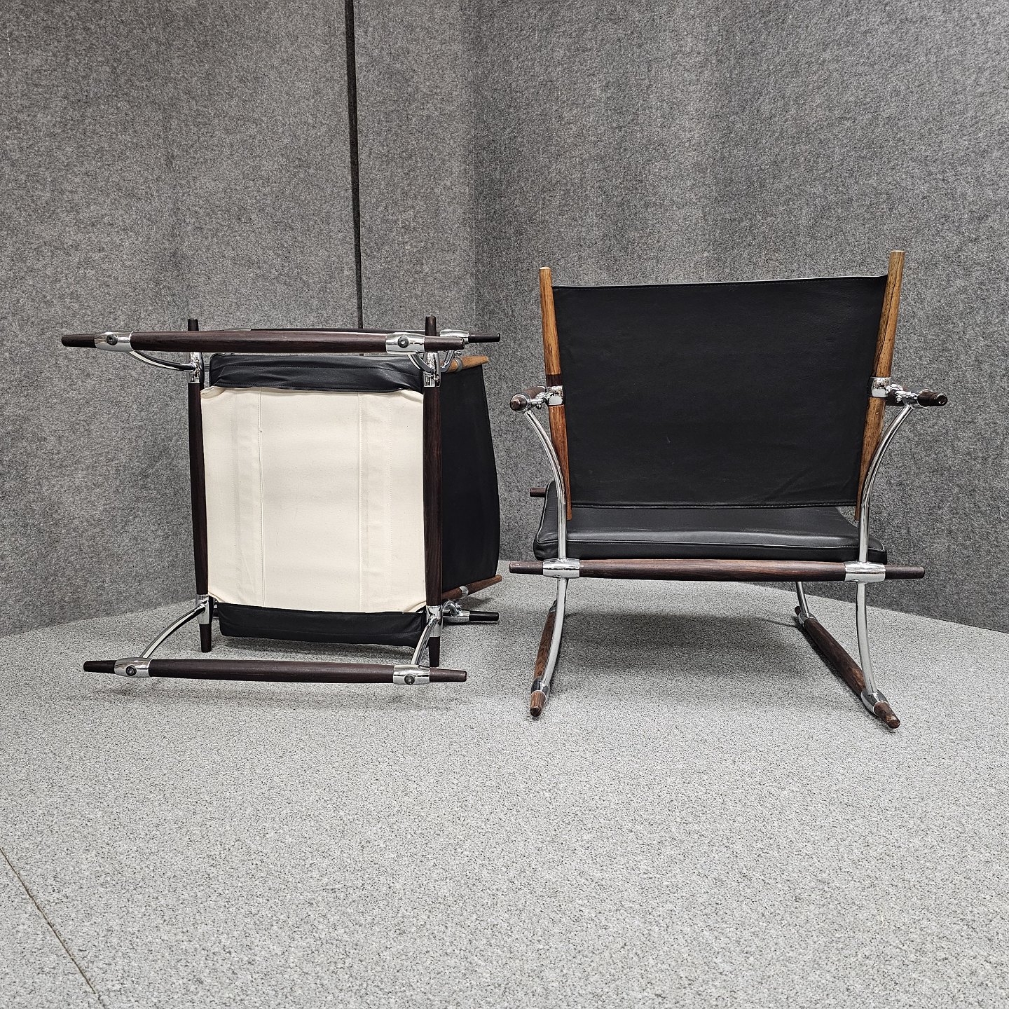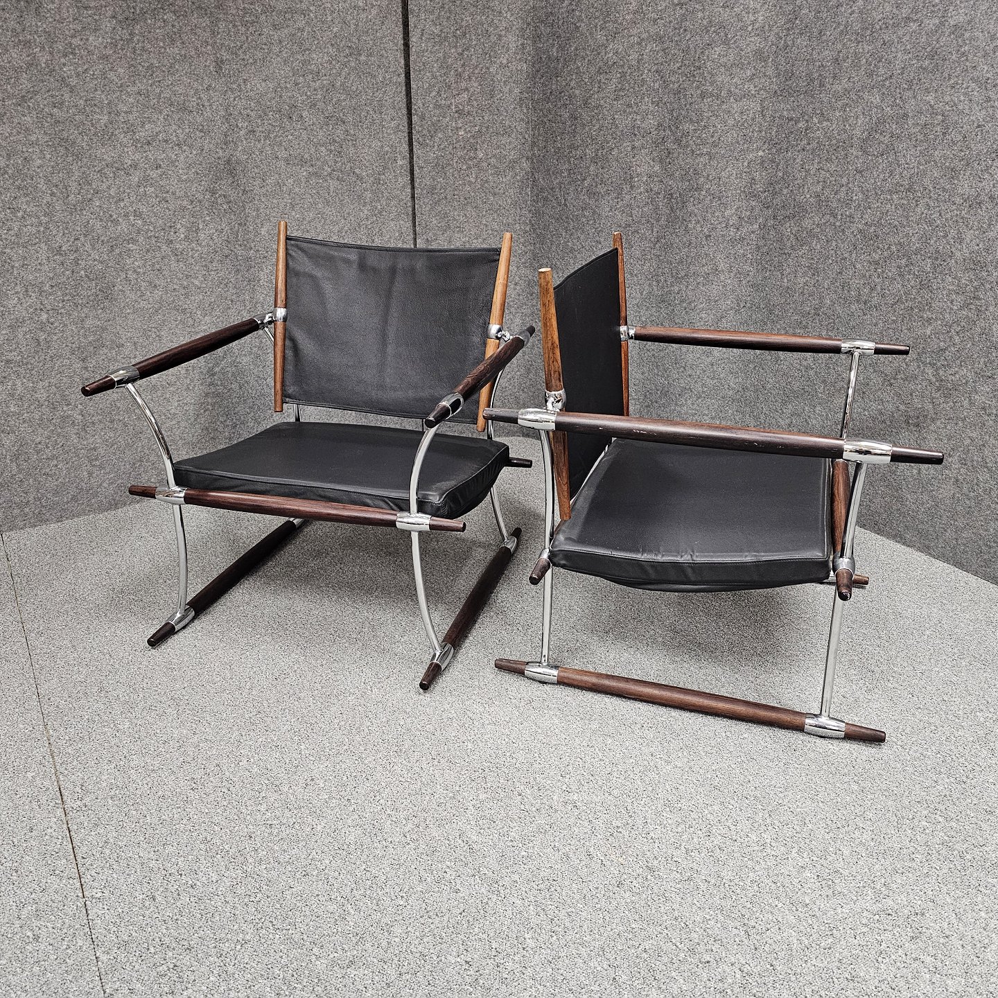 Text available in Danish: Sæt af to stokkestole med stel i palisander og forkromet stål og sæde af sort læder.