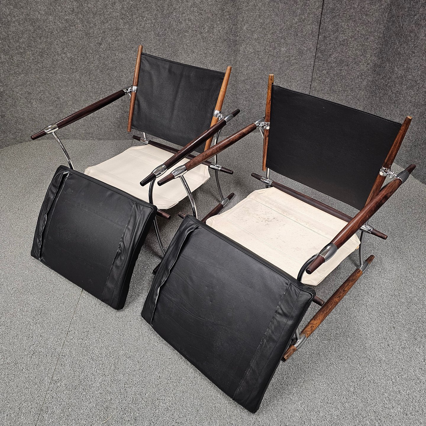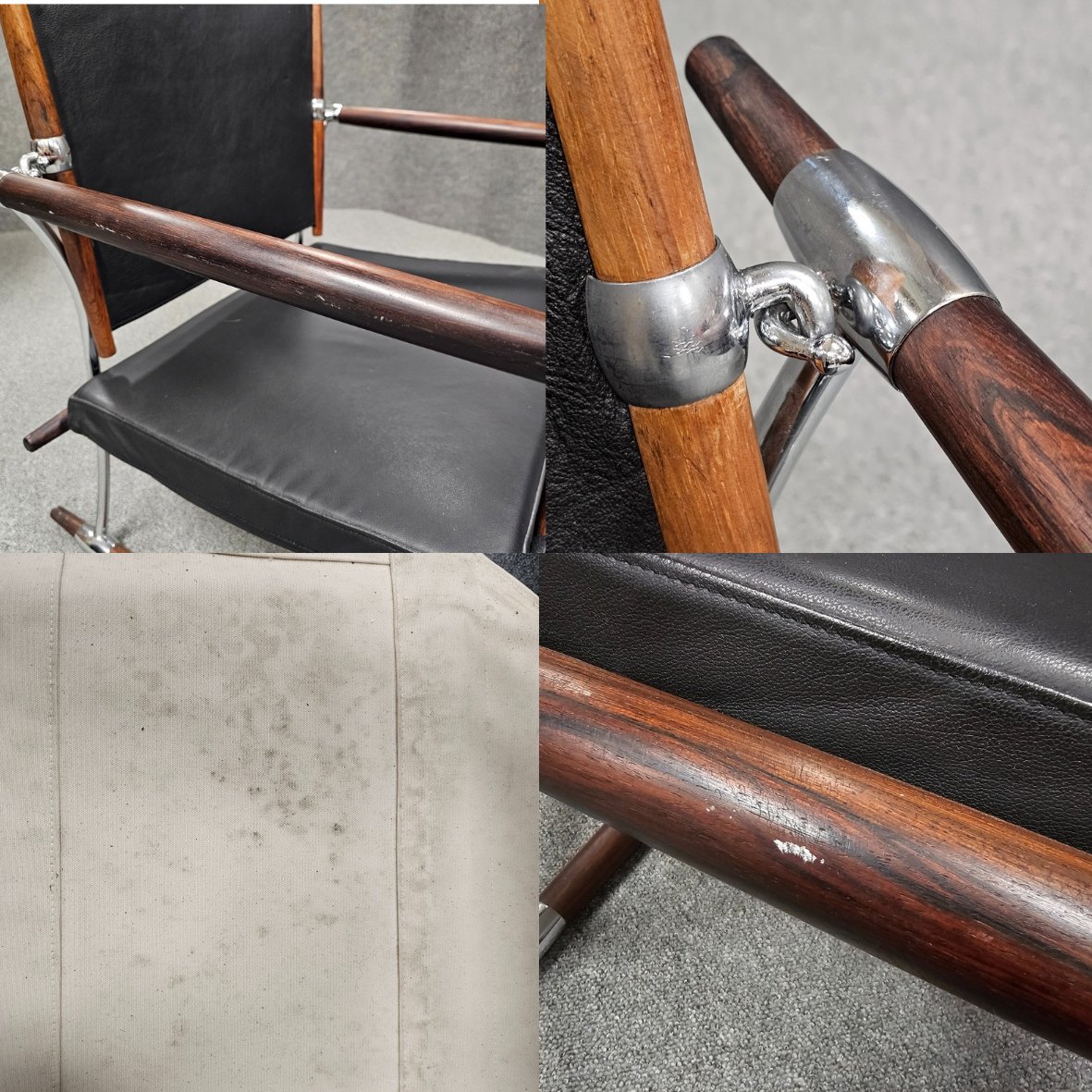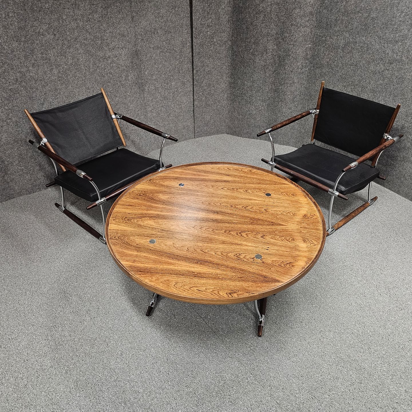 Text available in Danish: Sæt af to stokkestole med stel i palisander og forkromet stål og sæde af sort læder.